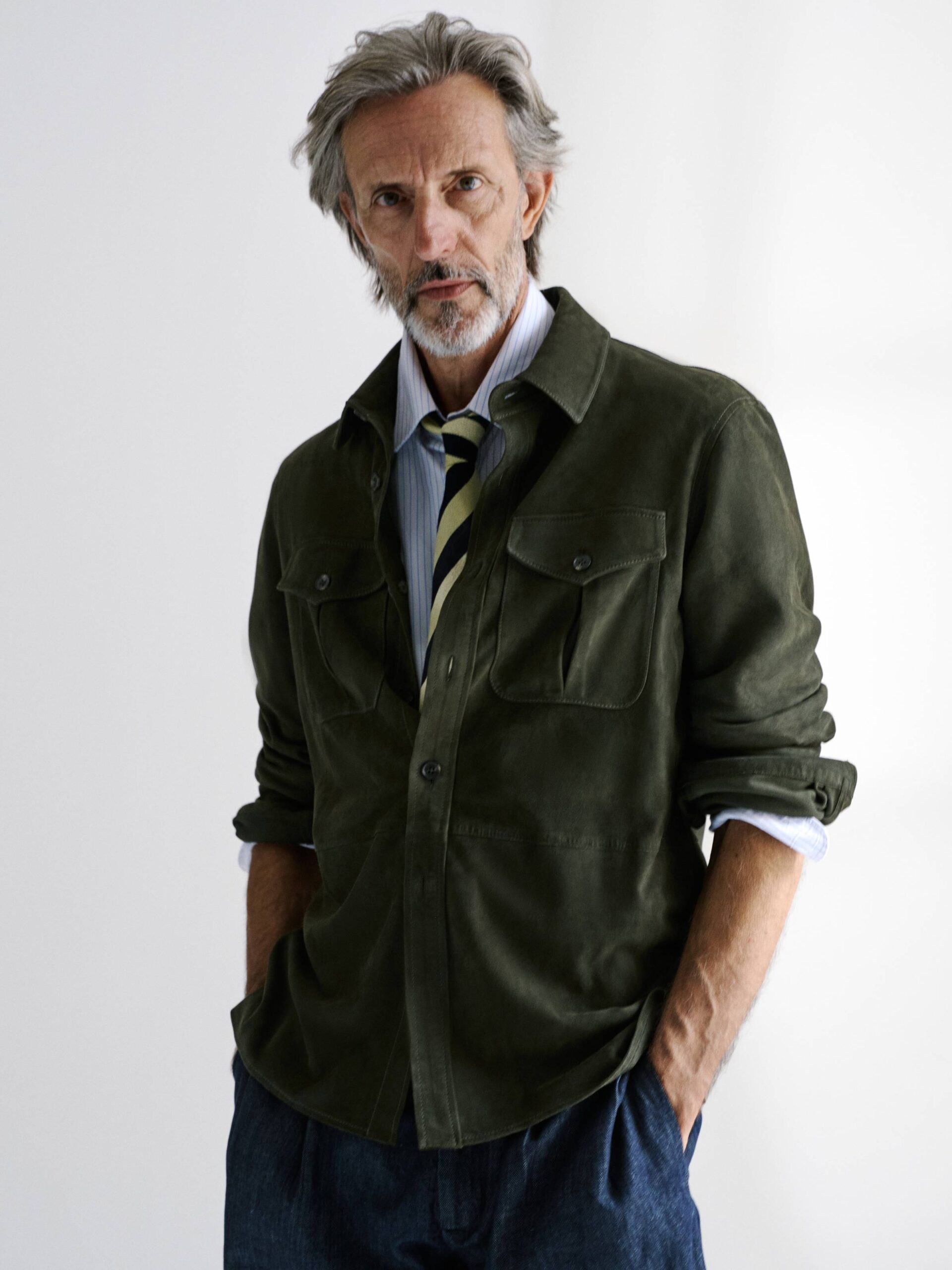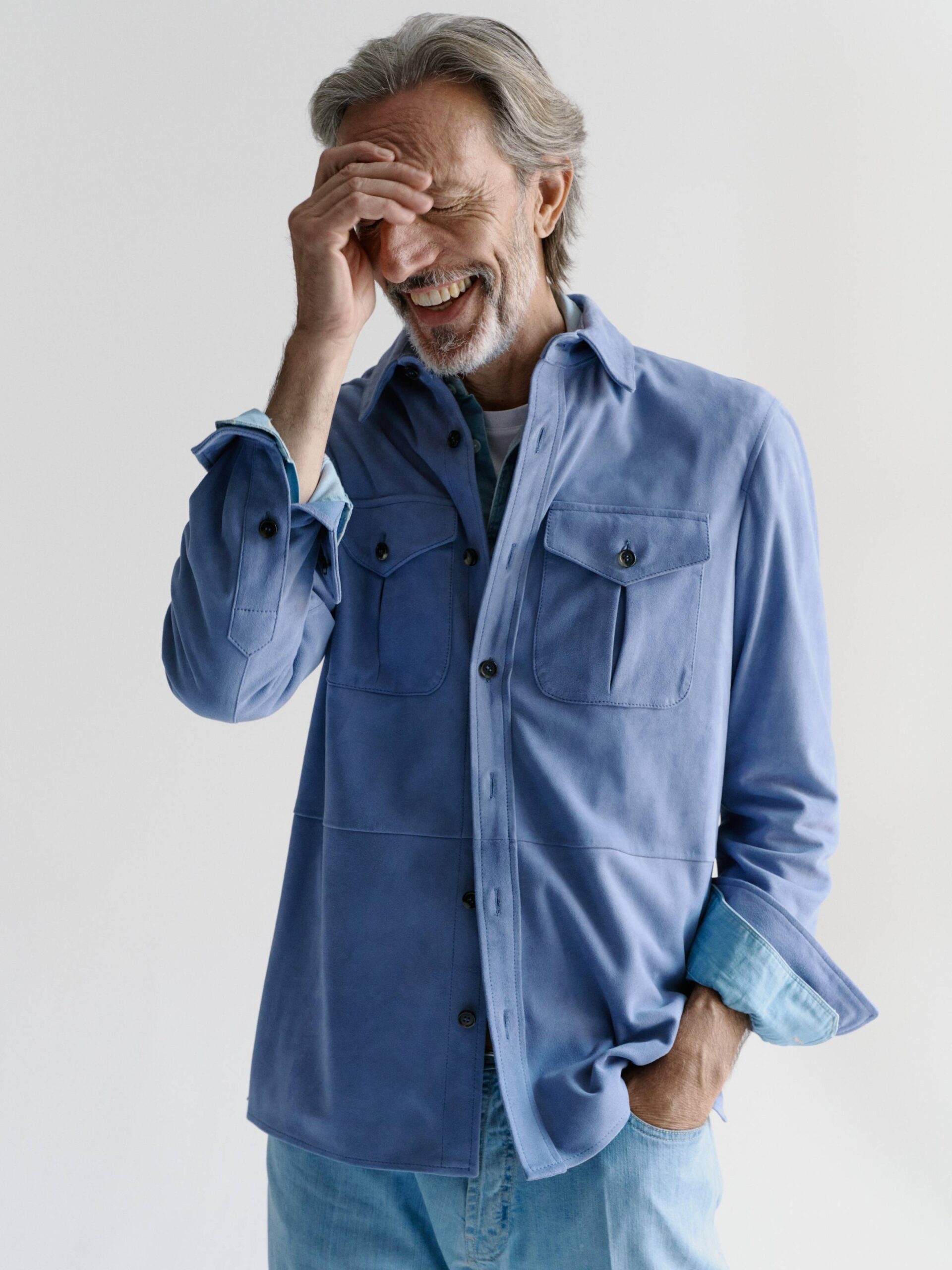 Men’s light suede shirt with buttons and a lightweight unlined construction.