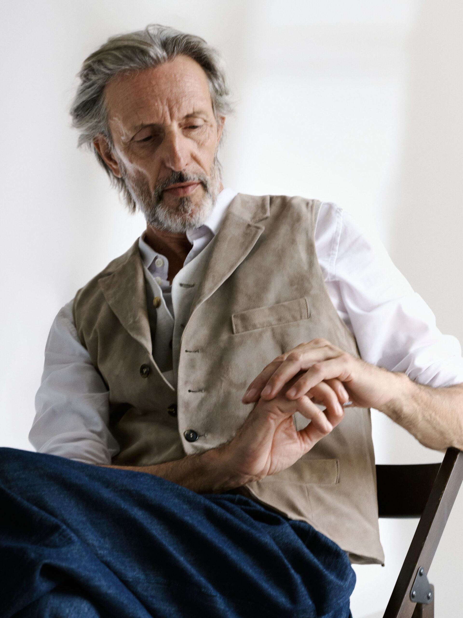 Suede and cotton vest with five-button closure, chest pocket and flap pockets.
