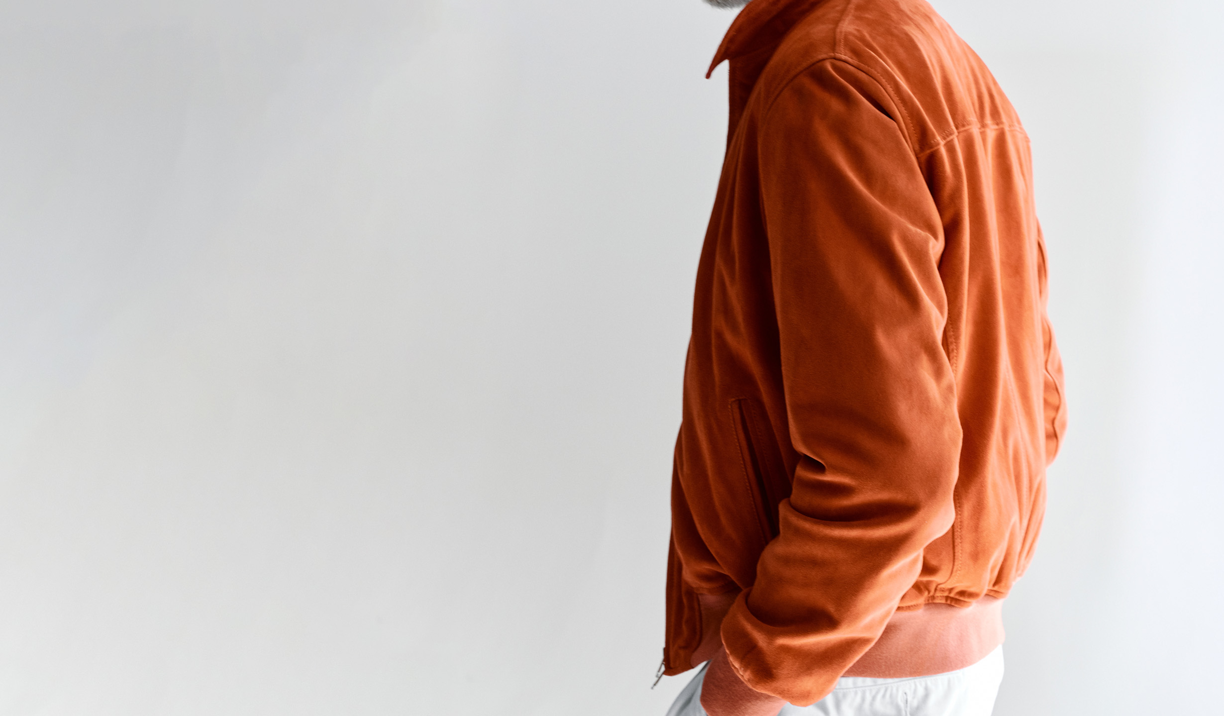 Suede jacket with concealed zip, patch pockets and ribbed hem.