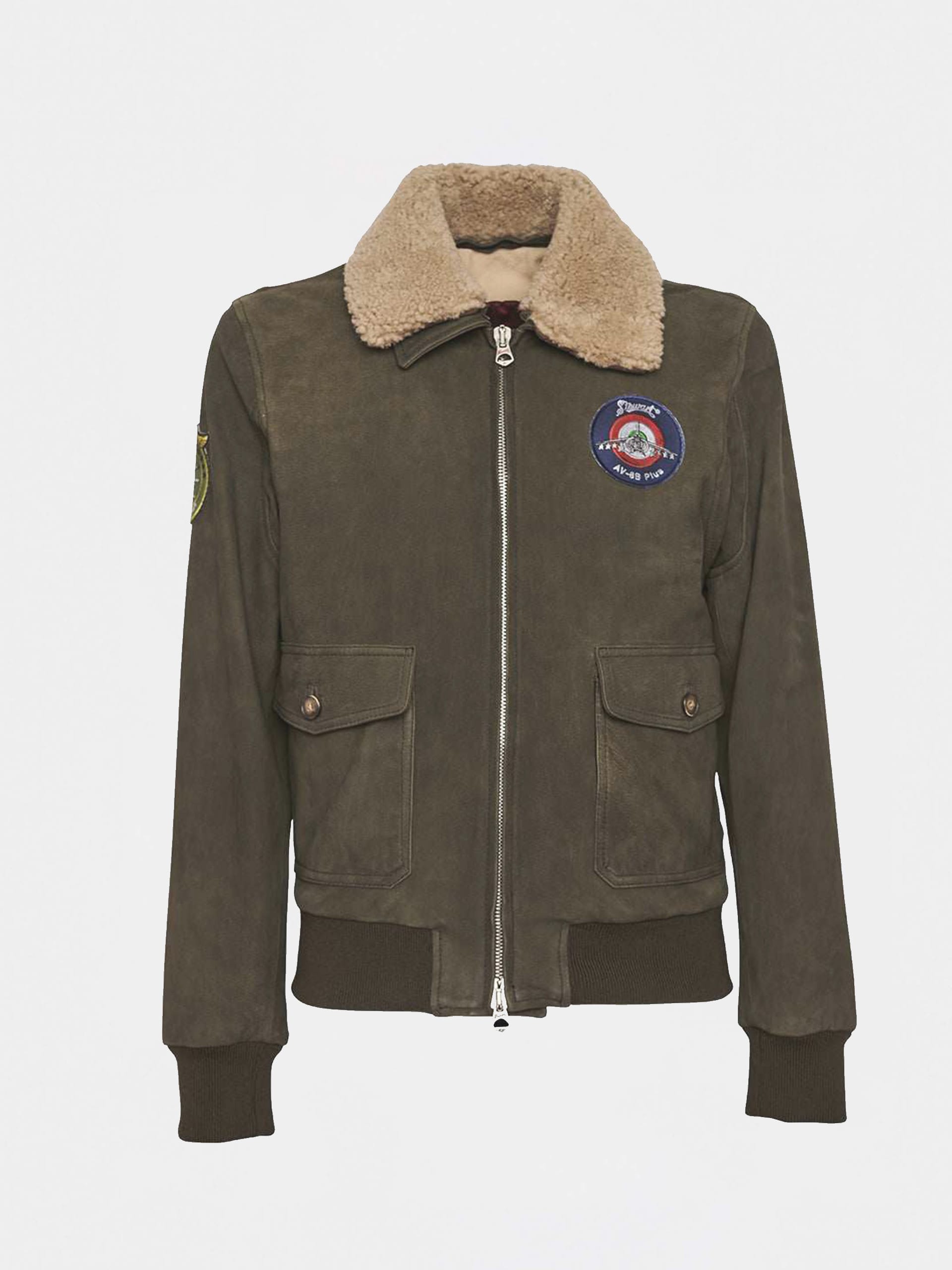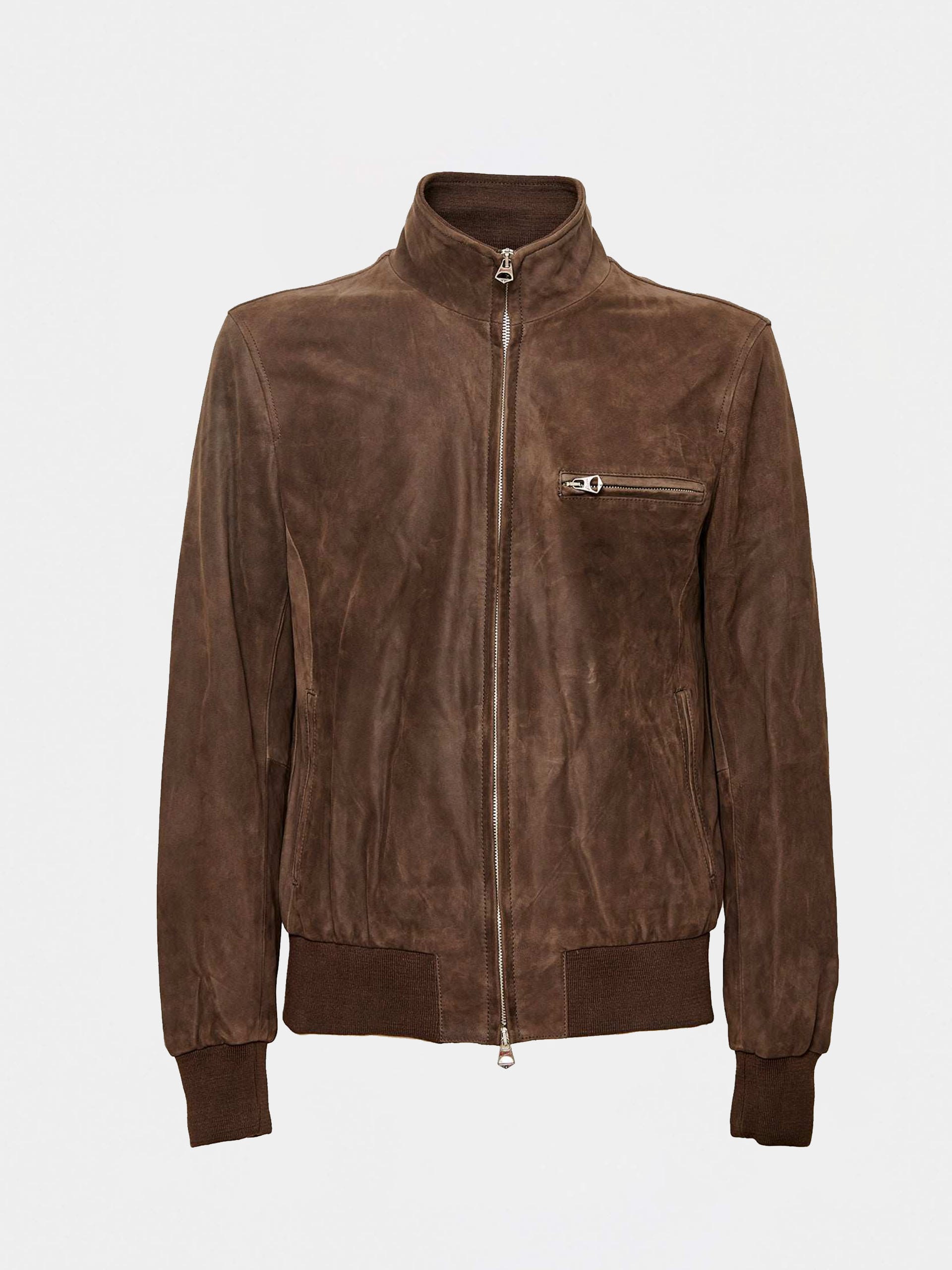 Men’s unlined jacket in thick suede, camoscione, offering a more structured yet lightweight feel.