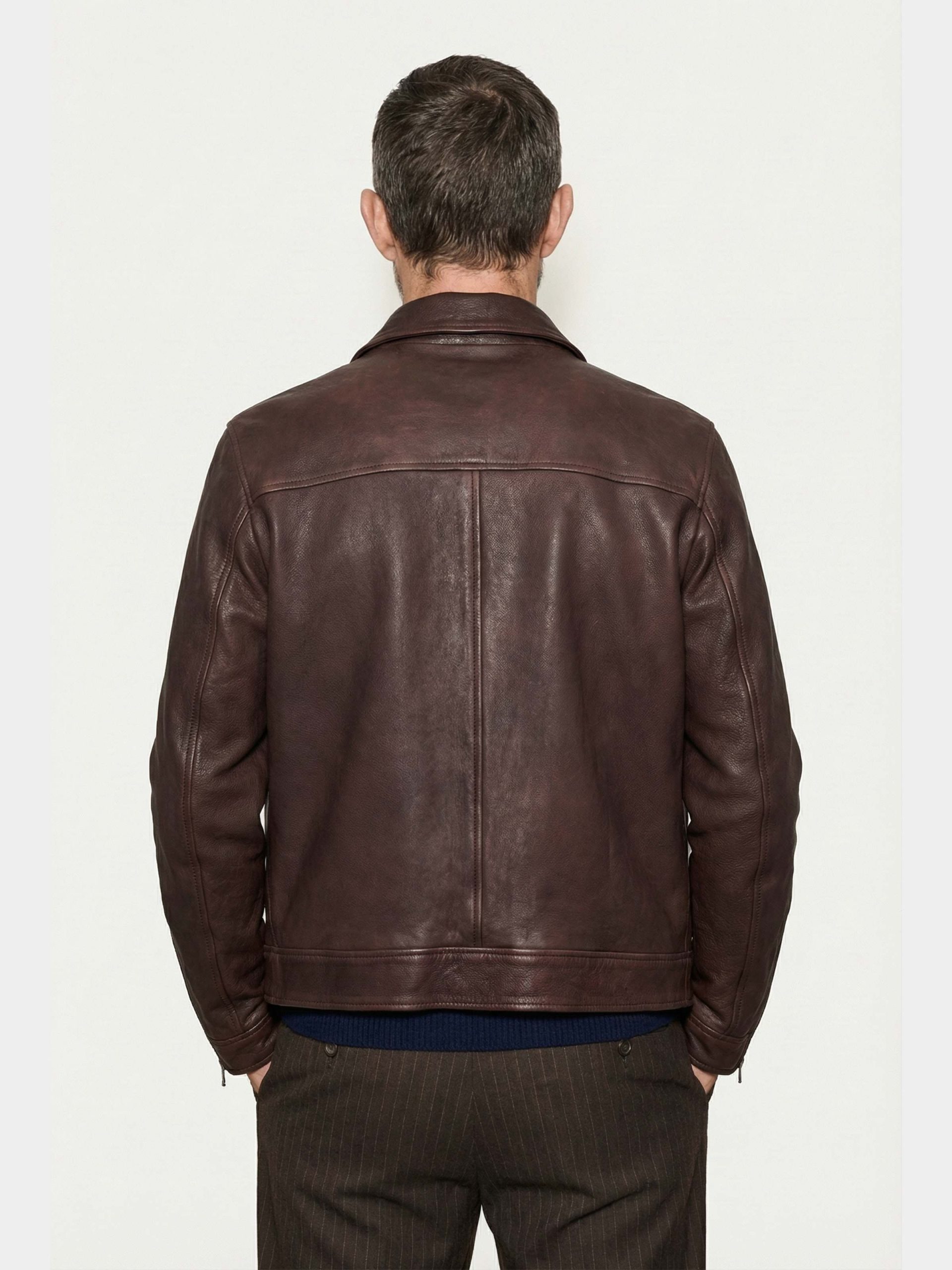 A jacket crafted from soft lambskin leather, it stands out for its central double-slider zip closure that ensures practicality and comfort. The shirt collar evokes a classic and refined style, while the two side zip pockets add functionality and security. This men’s leather jacket is perfect both for completing a casual chic look with jeans and for enhancing more elegant outfits with tailored trousers. An iconic piece that best represents Italian craftsmanship, premium quality, and contemporary design.
