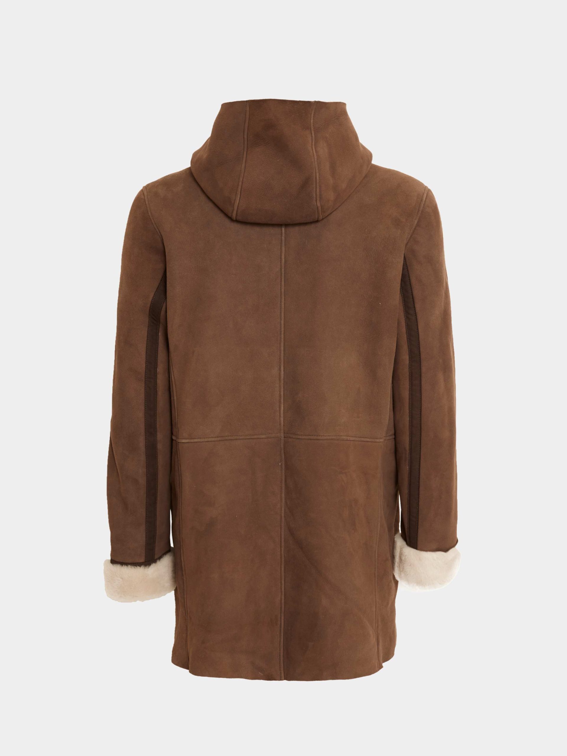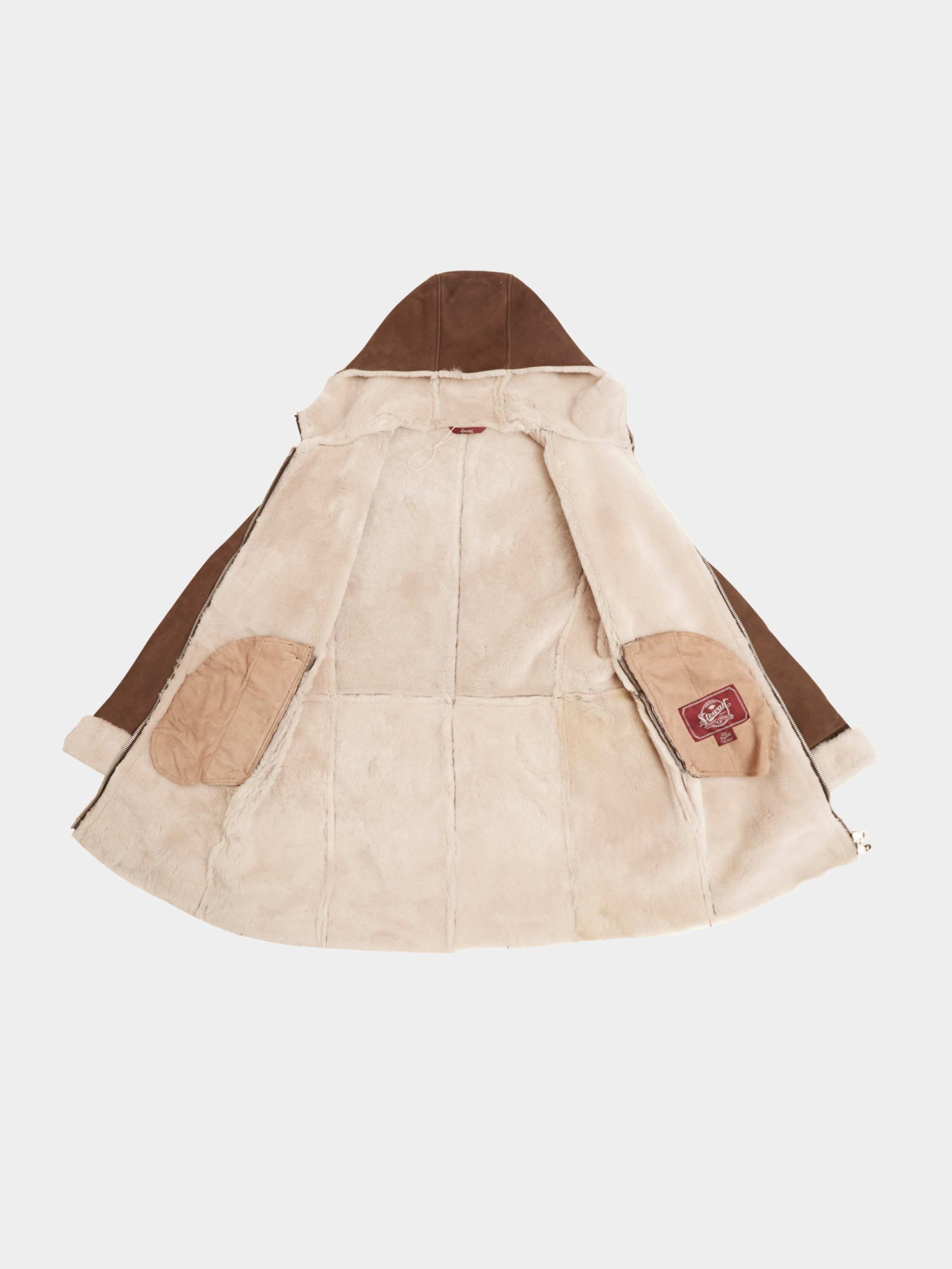 The Aric Shearling Suede Ironed Lamb coat is crafted from premium ironed merino shearling, featuring a smooth suede finish and warm beige shearling lining. Its double-slider front zipper and integrated hood provide comfort and practicality, while the zippered side pockets add functionality. A luxurious winter essential offering outstanding warmth, softness, and timeless style.