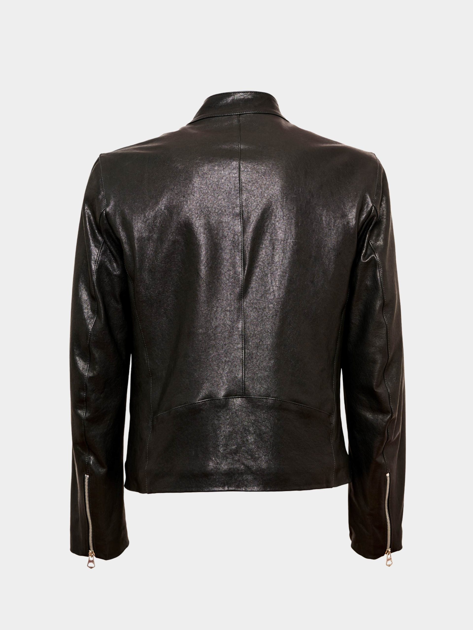 A jacket crafted from soft lambskin leather, it stands out for its central double-slider zip closure that ensures practicality and comfort.