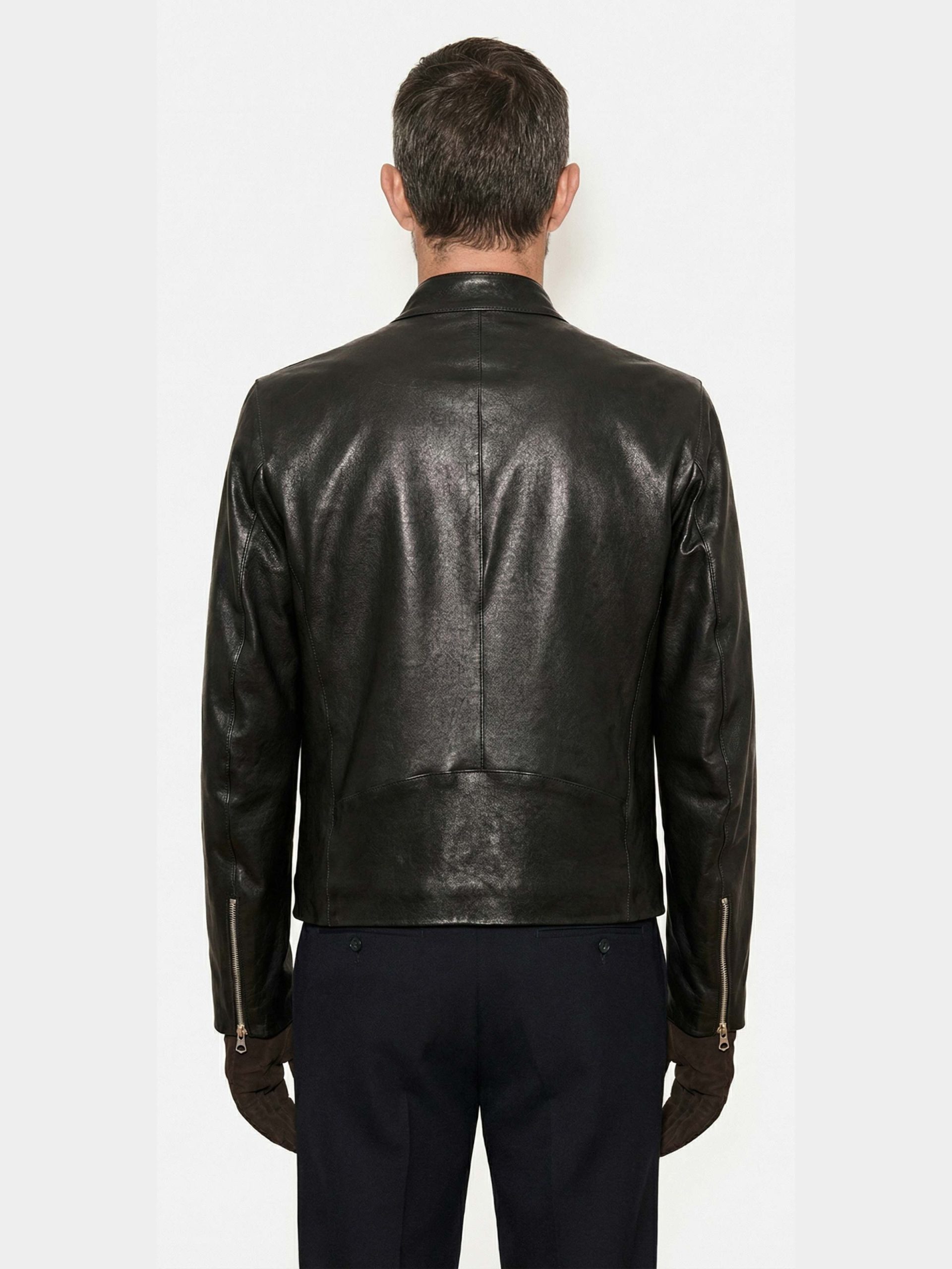 Men’s jacket in soft Nepal lamb leather with double zip and ribbed collar. Smooth, light, and essential in design.