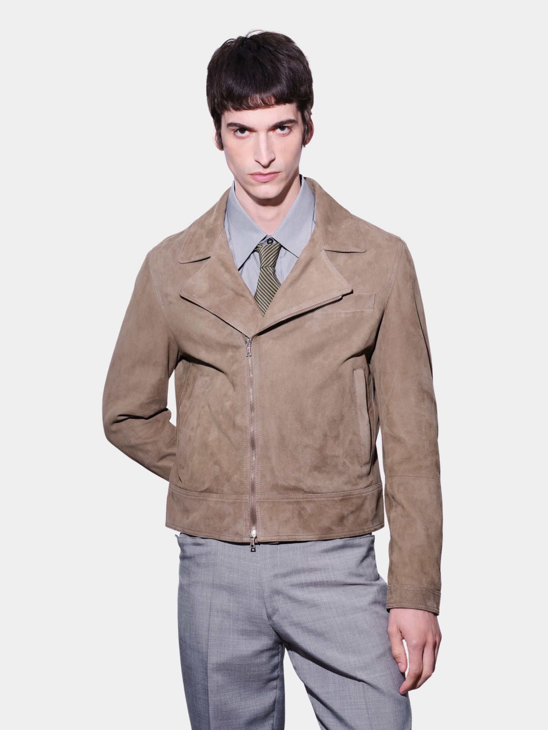 Men’s full-grain suede jacket, designed with a substantial texture that remains soft and comfortable thanks to its unlined construction.