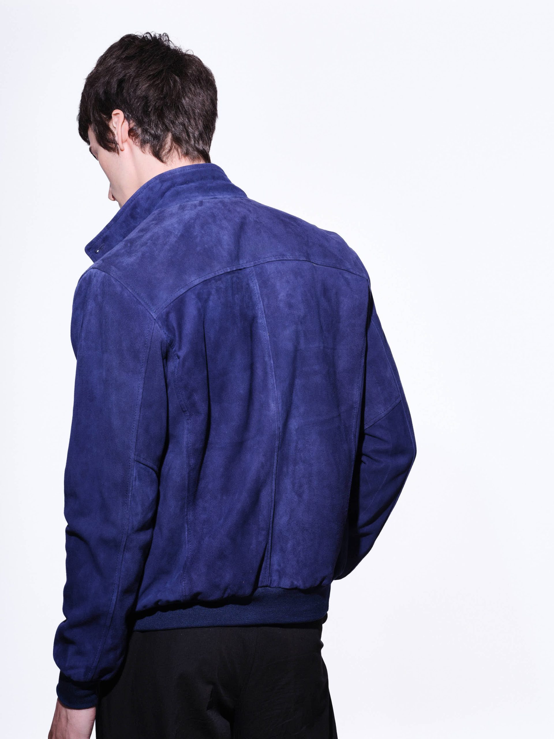 Unlined men’s jacket with double-slider zip closure, stand-up collar with ribbed knit interior, ribbed hem and cuff.