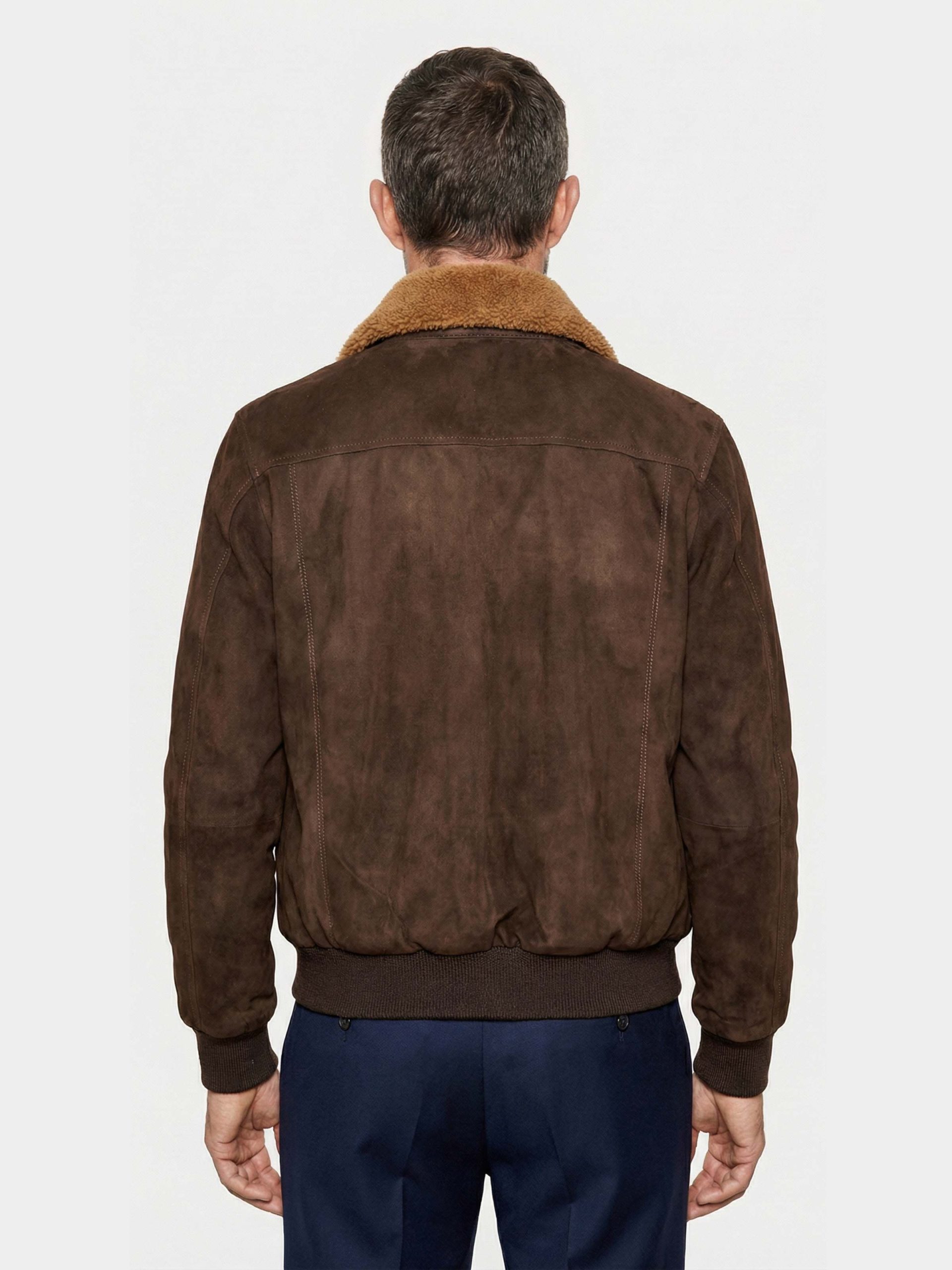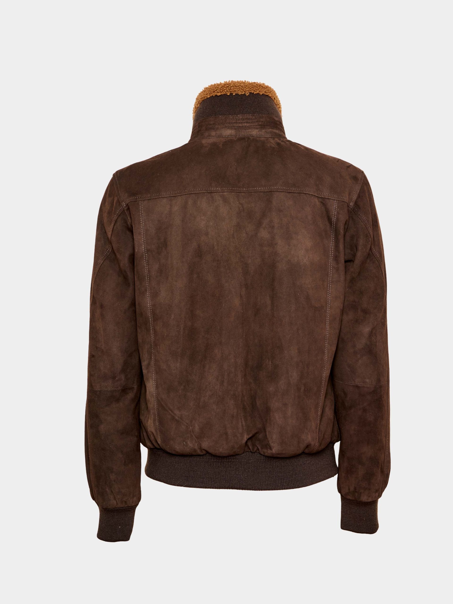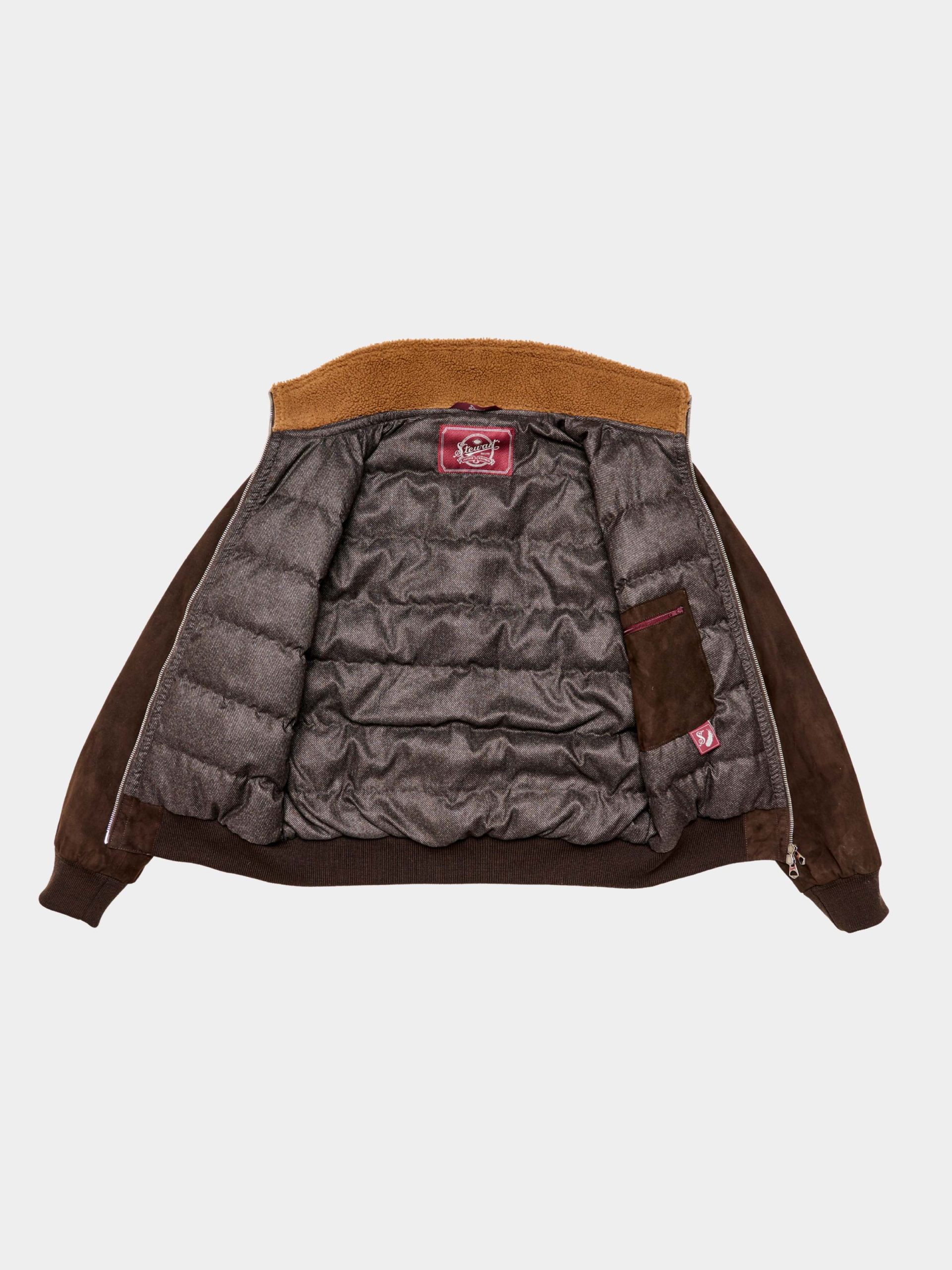 Goat suede garment-dyed jacket with double-zip, baracuta collar and cotton lining. Soft, durable and perfect for transitional wear.