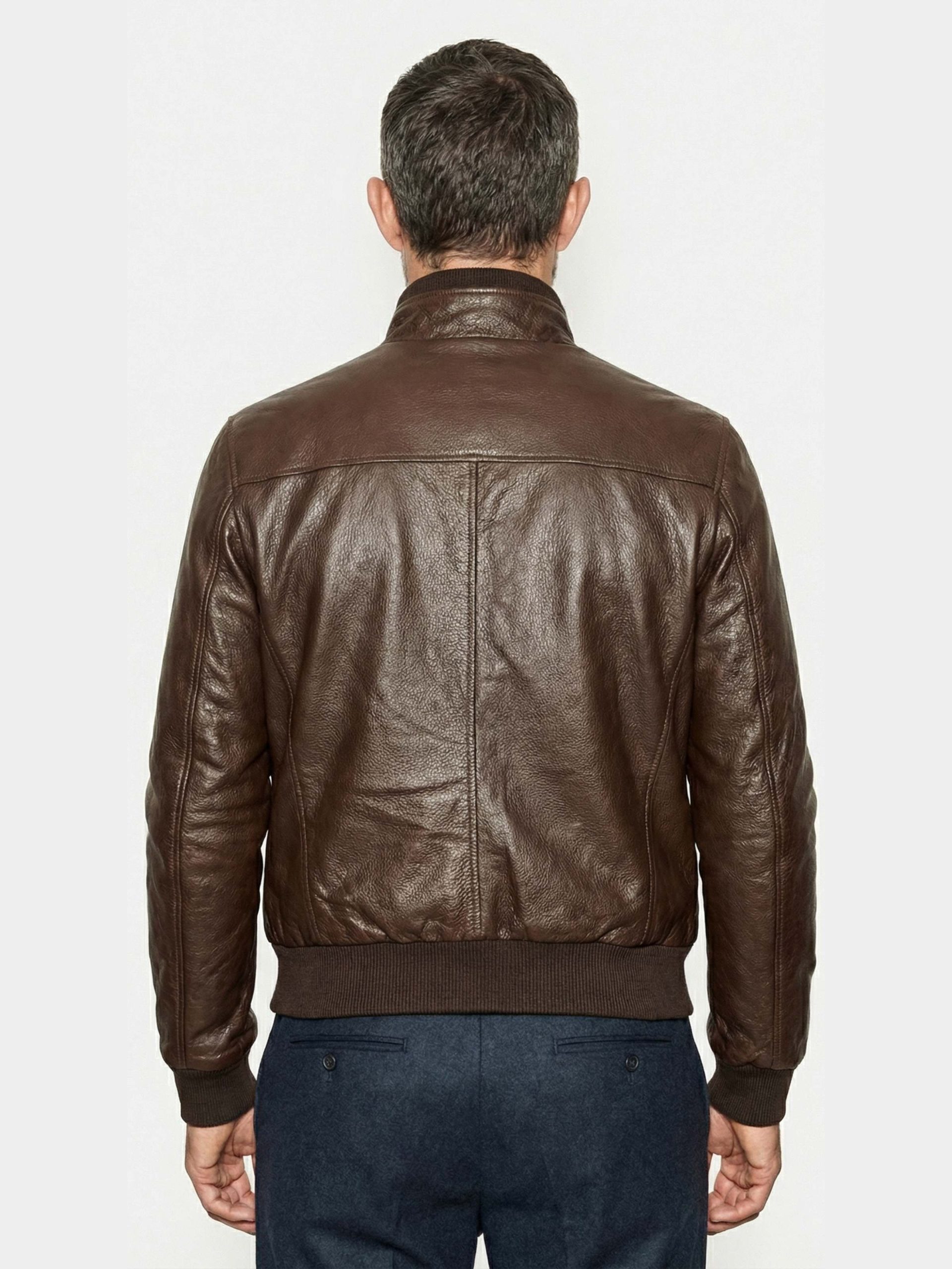 Men’s shearling jacket in “ironed” suede lamb with beige shearling collar, zip and button closure, and side zip pockets. Warm, soft, and timeless.