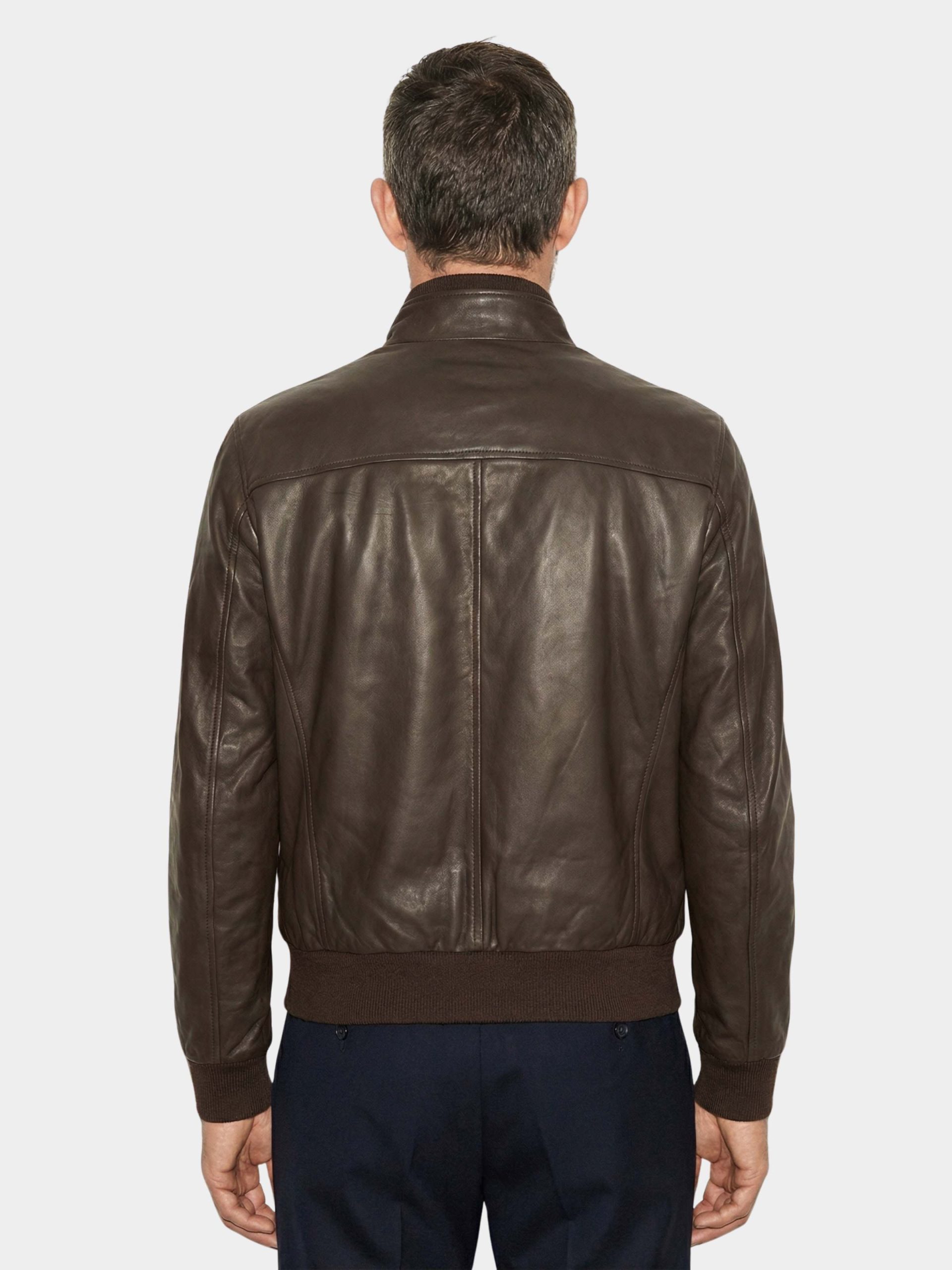 Biker men’s jacket in hammered lamb leather with real goose down padding. Warm, lightweight, and handcrafted in Italy.