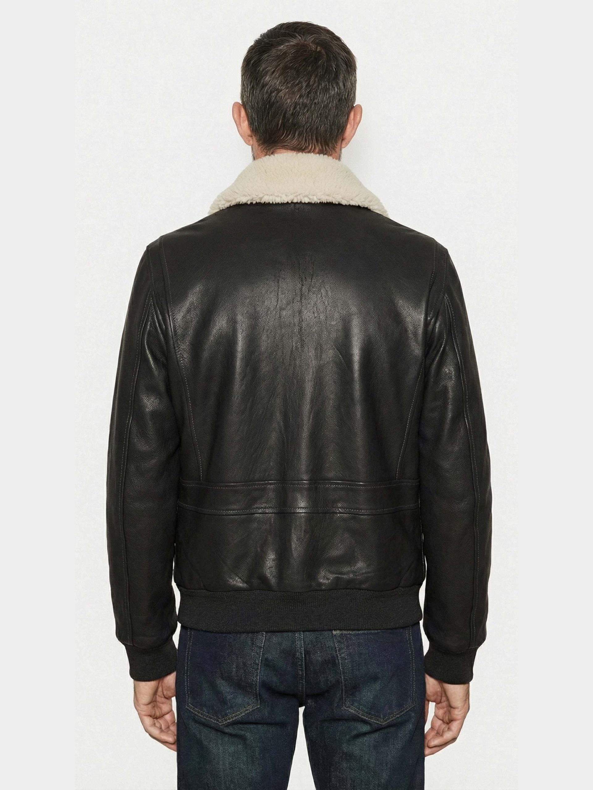 Omega leather jacket with removable shearling collar, double-slider zip and authentic aviator details for comfort, warmth and versatility.