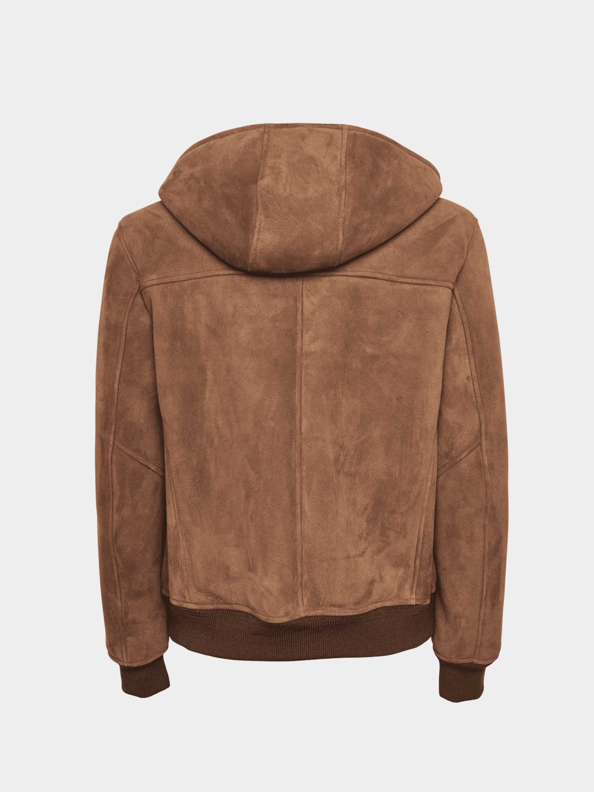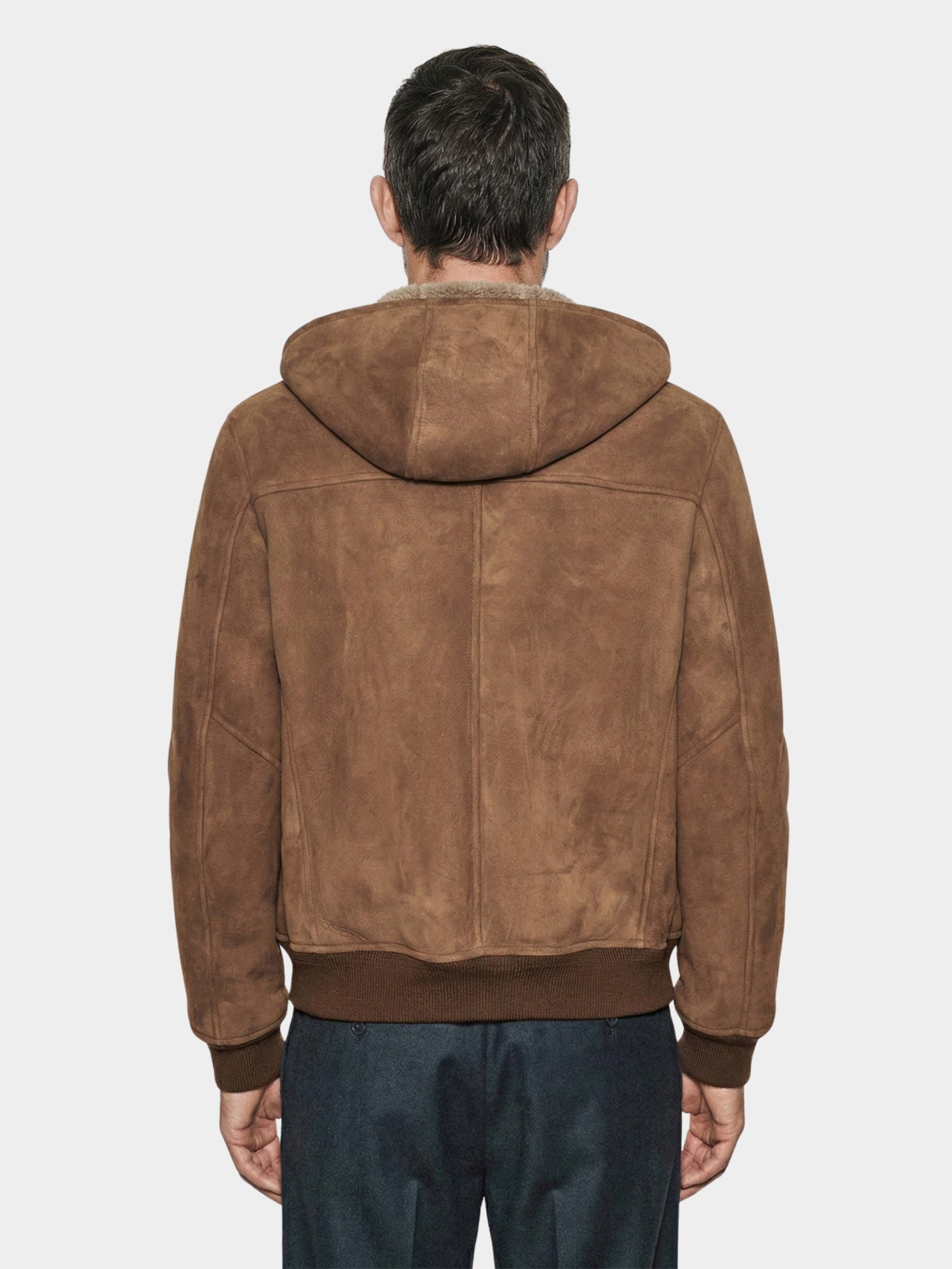 Einar jacket crafted from premium Merino Shearling Suede Brisa, featuring a soft, lightweight feel with a fully lined natural shearling interior. The integrated hood and double-slider metal zip enhance comfort and functionality, while rib-knit cuffs and hem ensure a perfect fit. A warm, refined, and versatile winter piece in an elegant hazelnut shade.