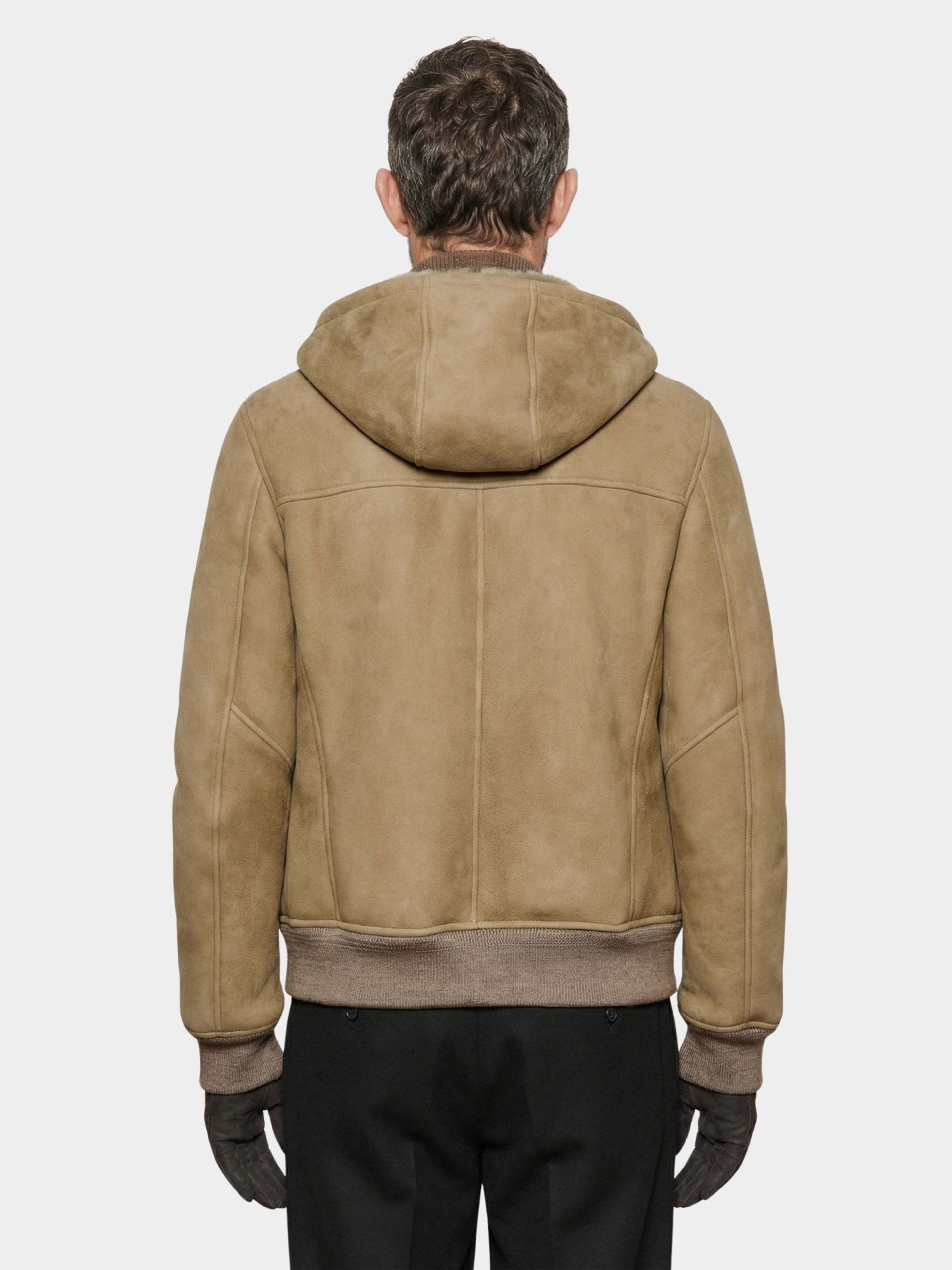 Ironed lamb shearling coat with hood, double-slider zip and smooth suede finish. Warm, refined and perfect for colder days.