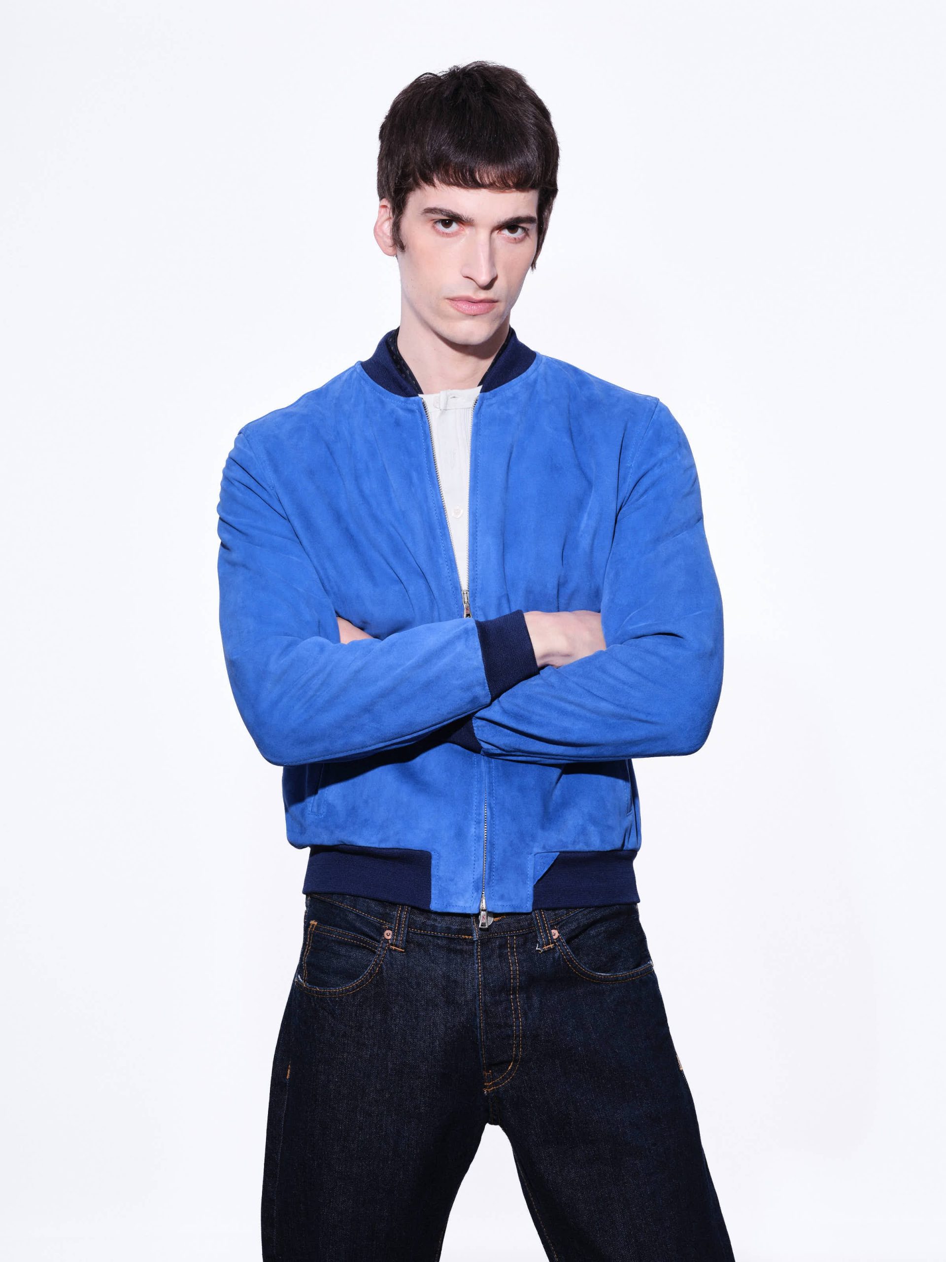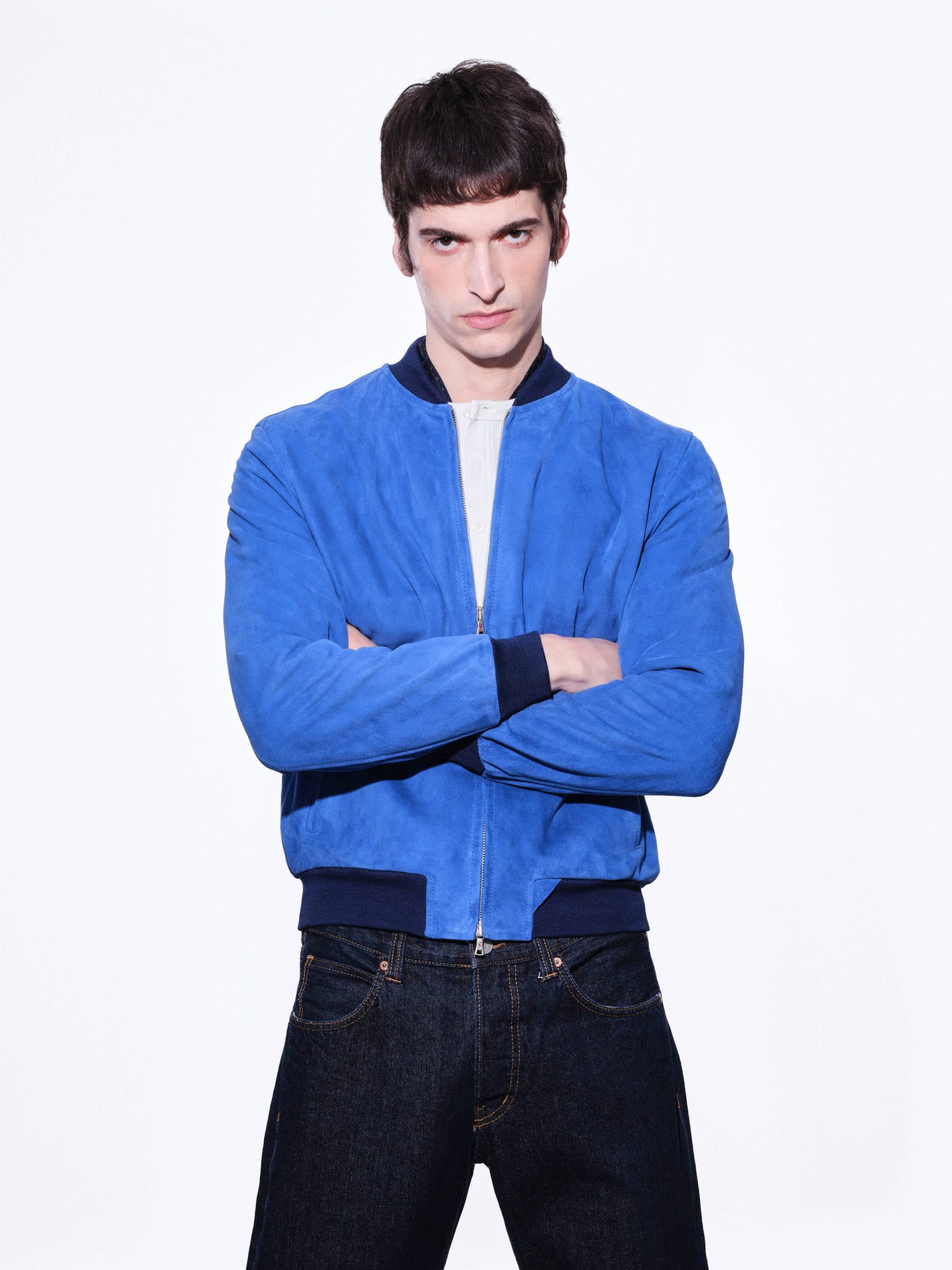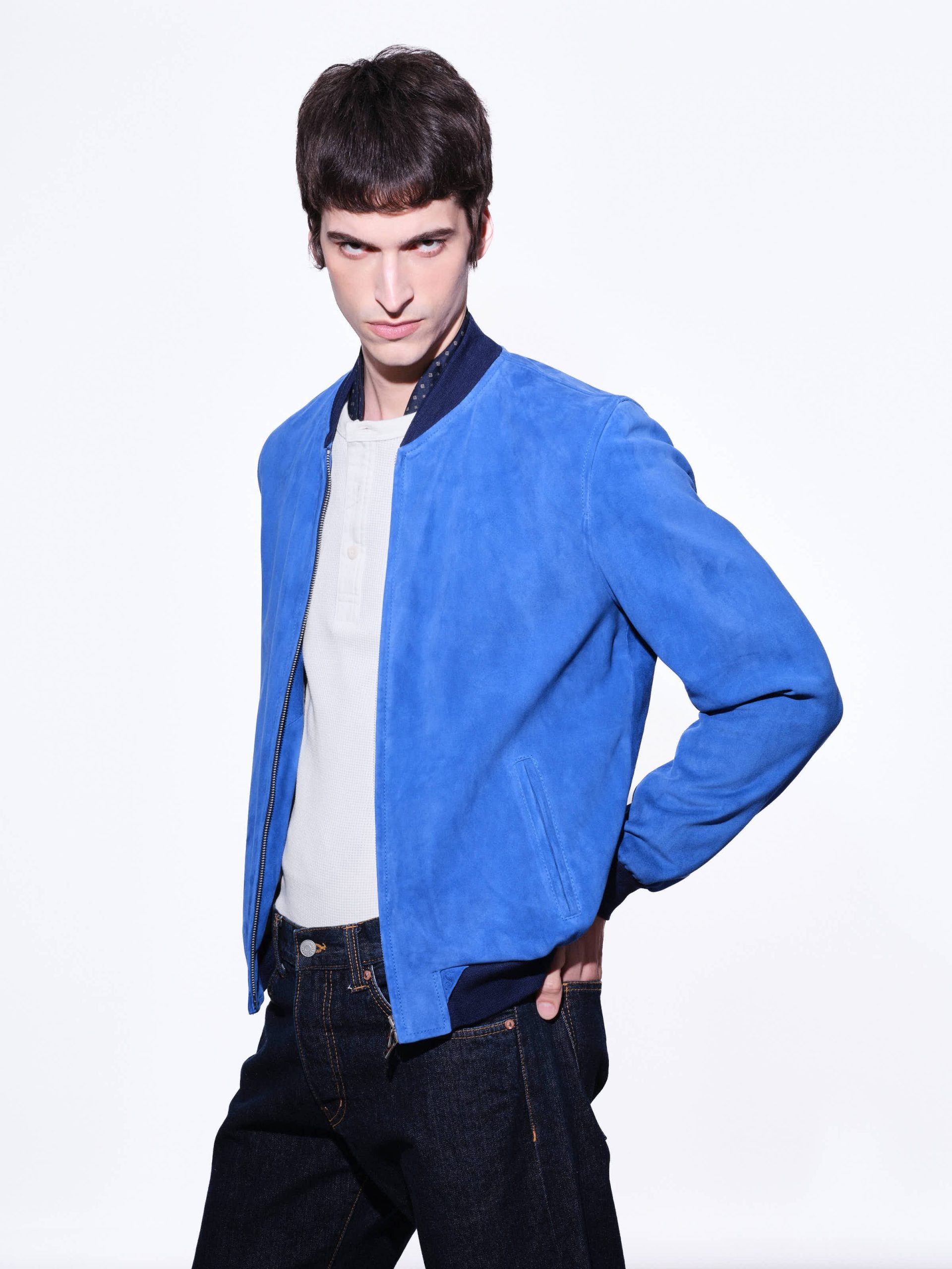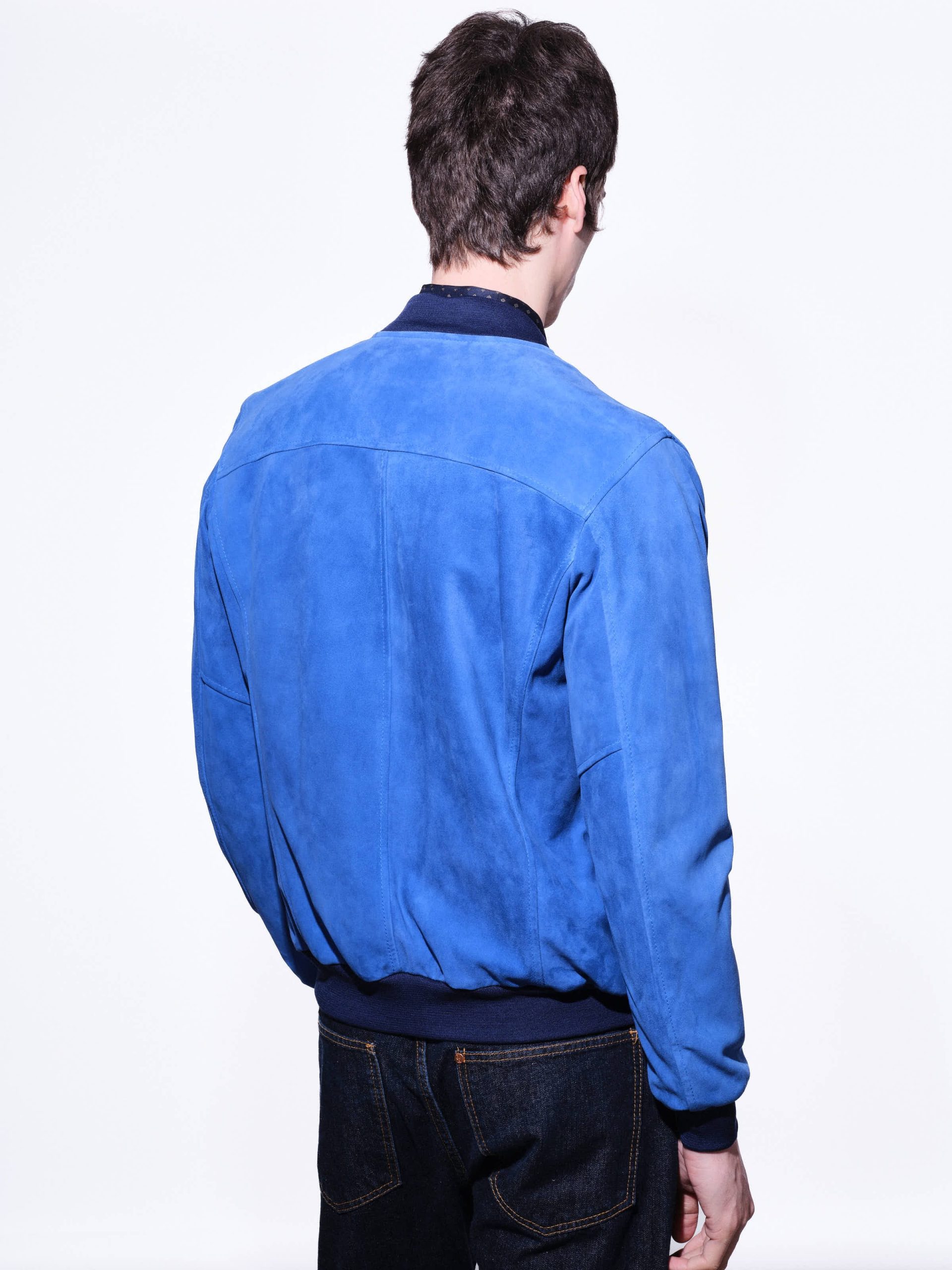Unlined men’s jacket with double-slider zip closure, stand-up collar with ribbed knit interior, two side welt pockets, and ribbed hem and cuffs.