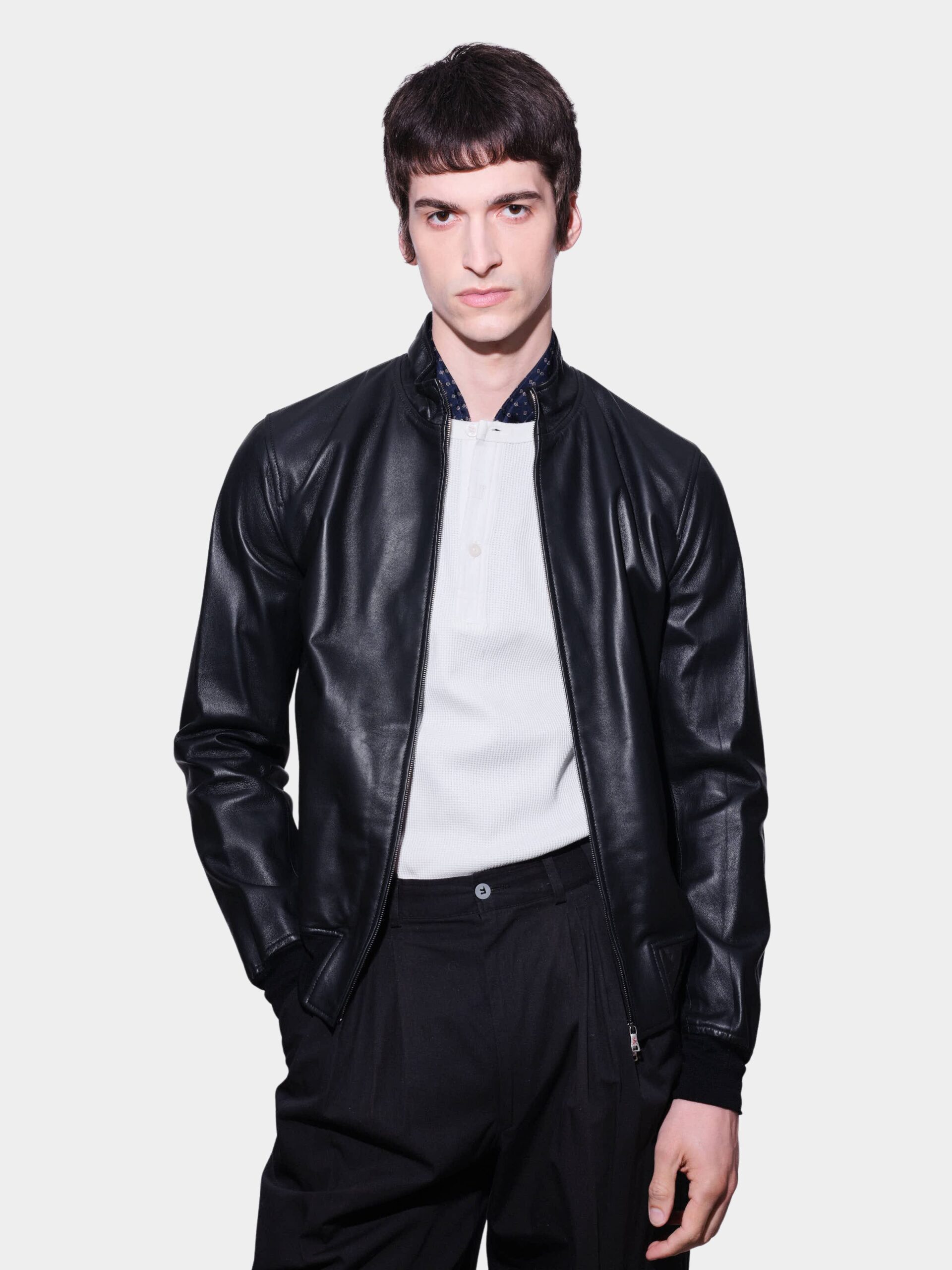 Men’s jacket in soft and lightweight nappa leather, designed to combine comfort, style, and functionality. The unlined construction ensures maximum lightness, while the interior is enriched with an exclusive “pied de poule” printed motif. Front closure with double-slider zip, collar with knitted insert and button fastening, and ribbed knit cuffs and hem for a more comfortable fit. Finished with welt pockets and an internal pocket with button closure to securely store essentials.