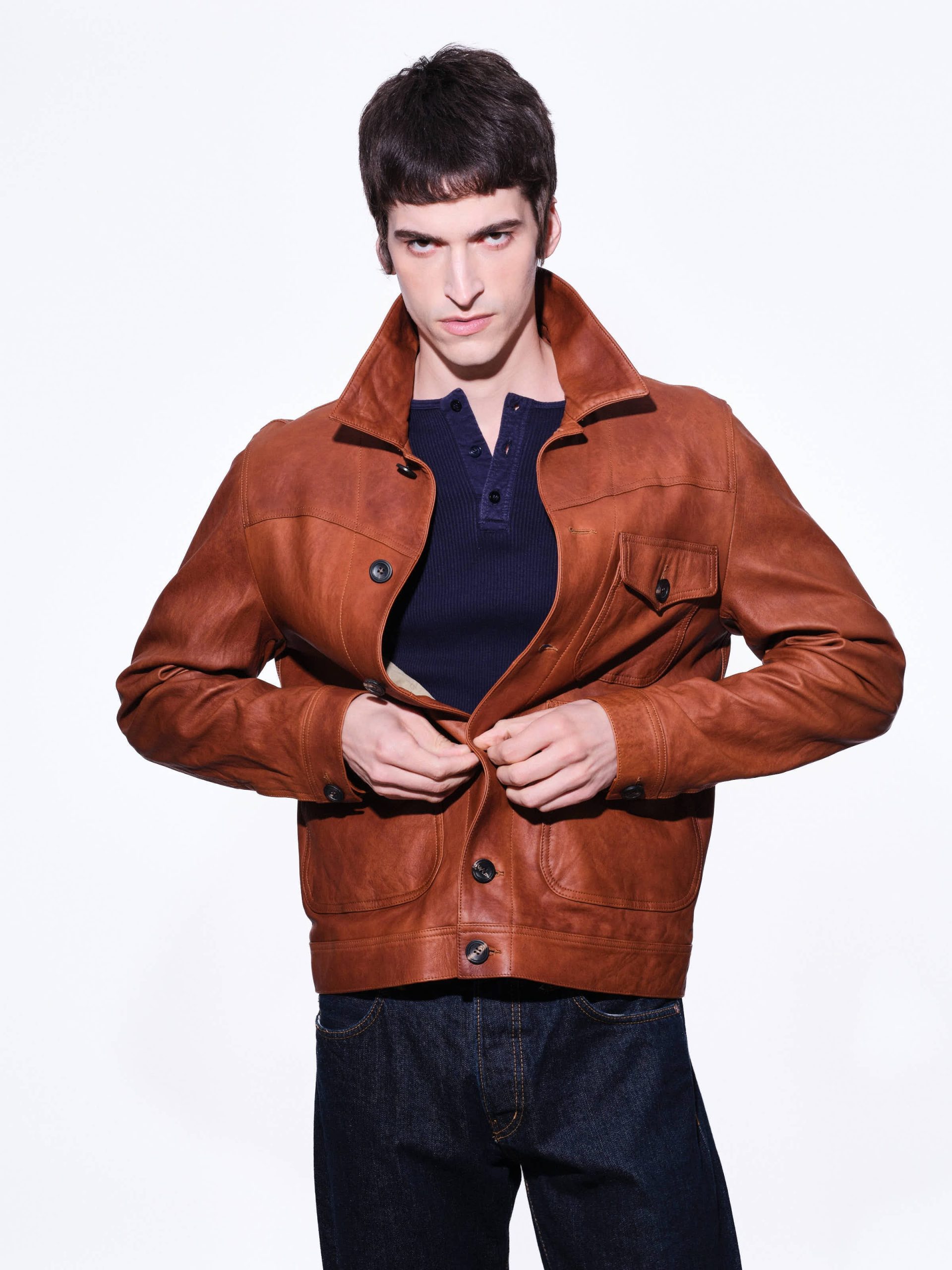 Men’s unlined jacket in thick suede, camoscione, offering a more structured yet lightweight feel.