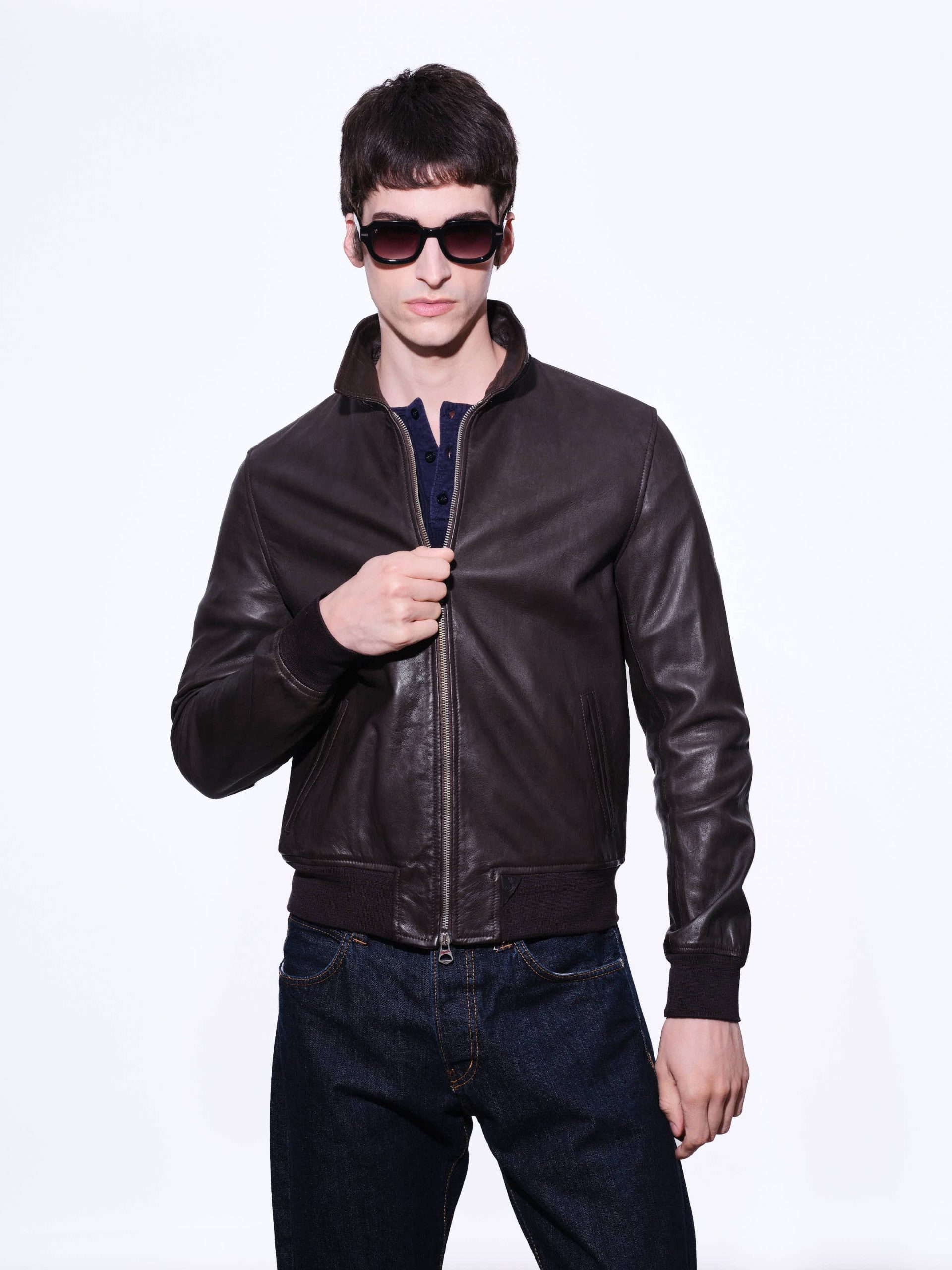 Men’s biker-style jacket with a double-slider front zip and stand-up collar
