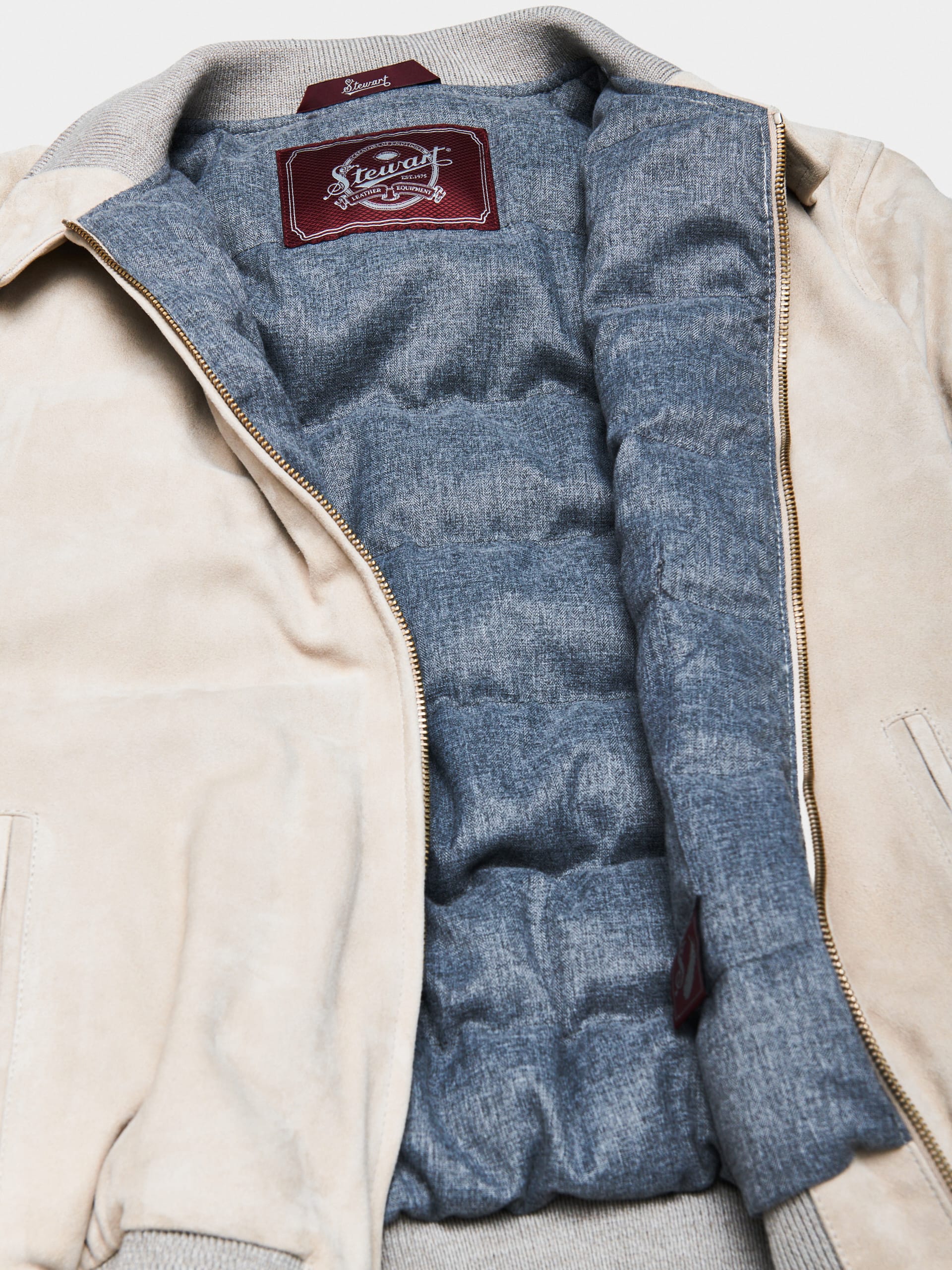 Unlined jacket with double slider zip closure, standing collar with knitted interior.