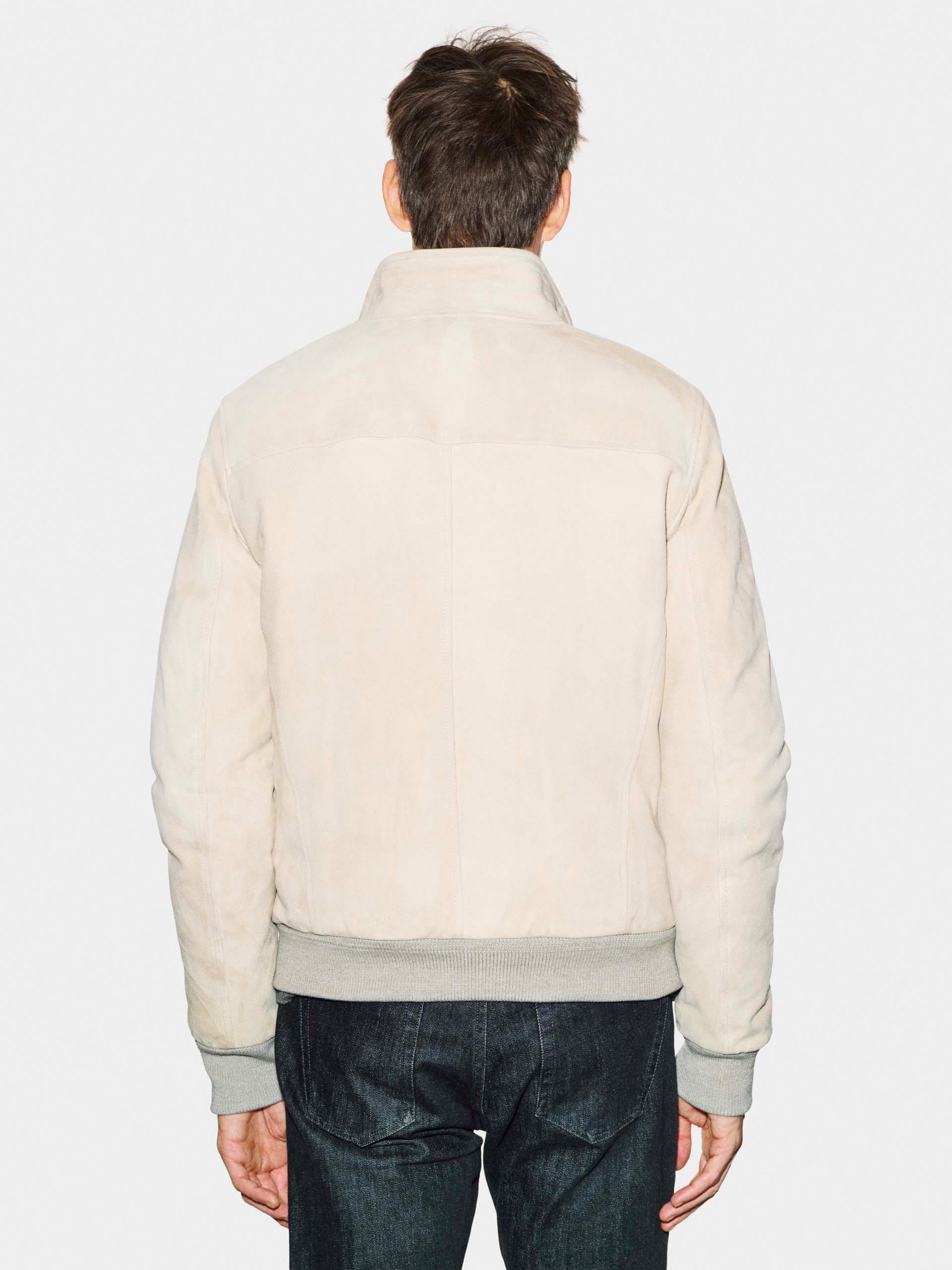 Unlined men’s jacket with double-slider zip closure, stand-up collar with ribbed knit interior and two-button fastening