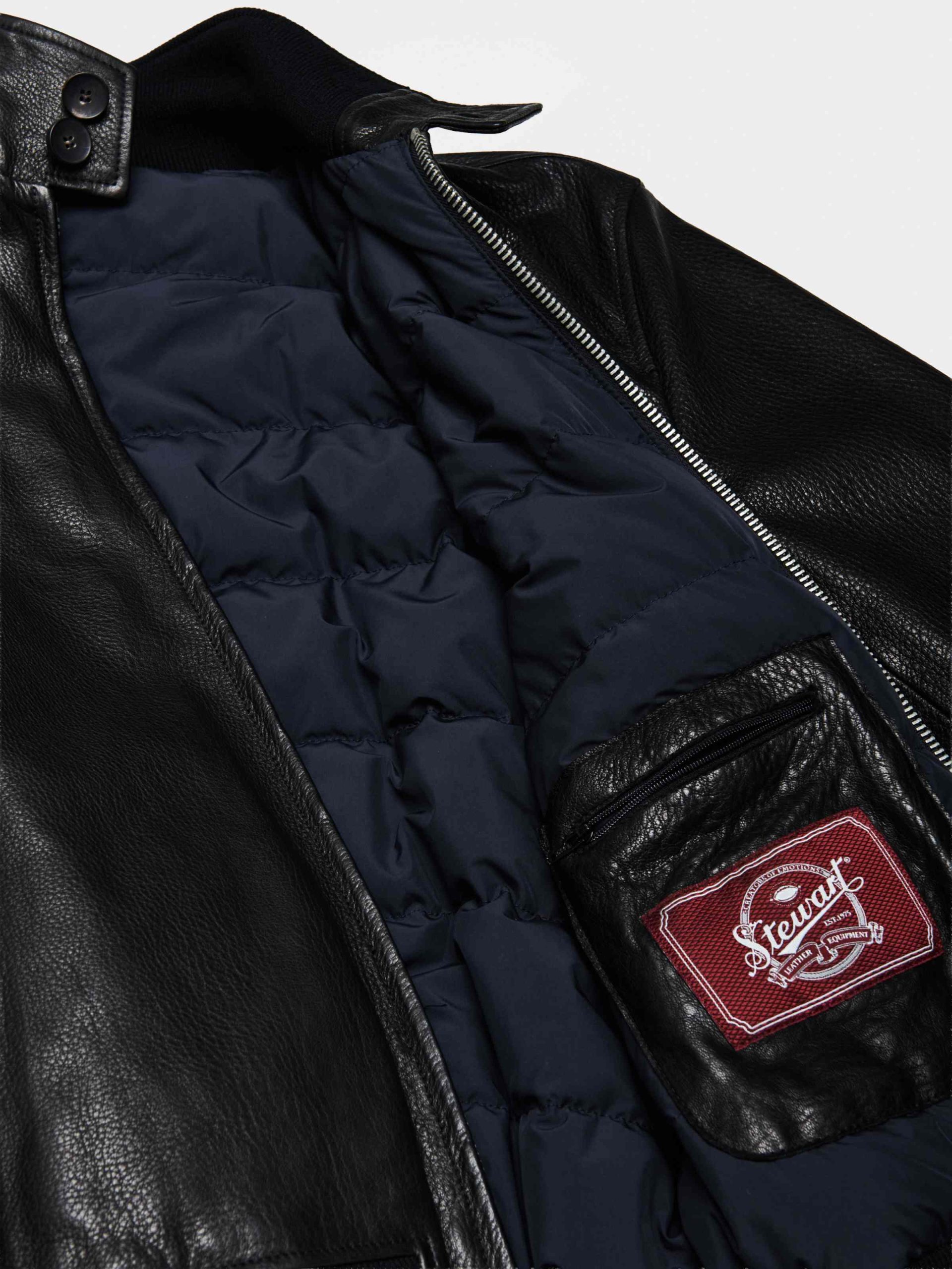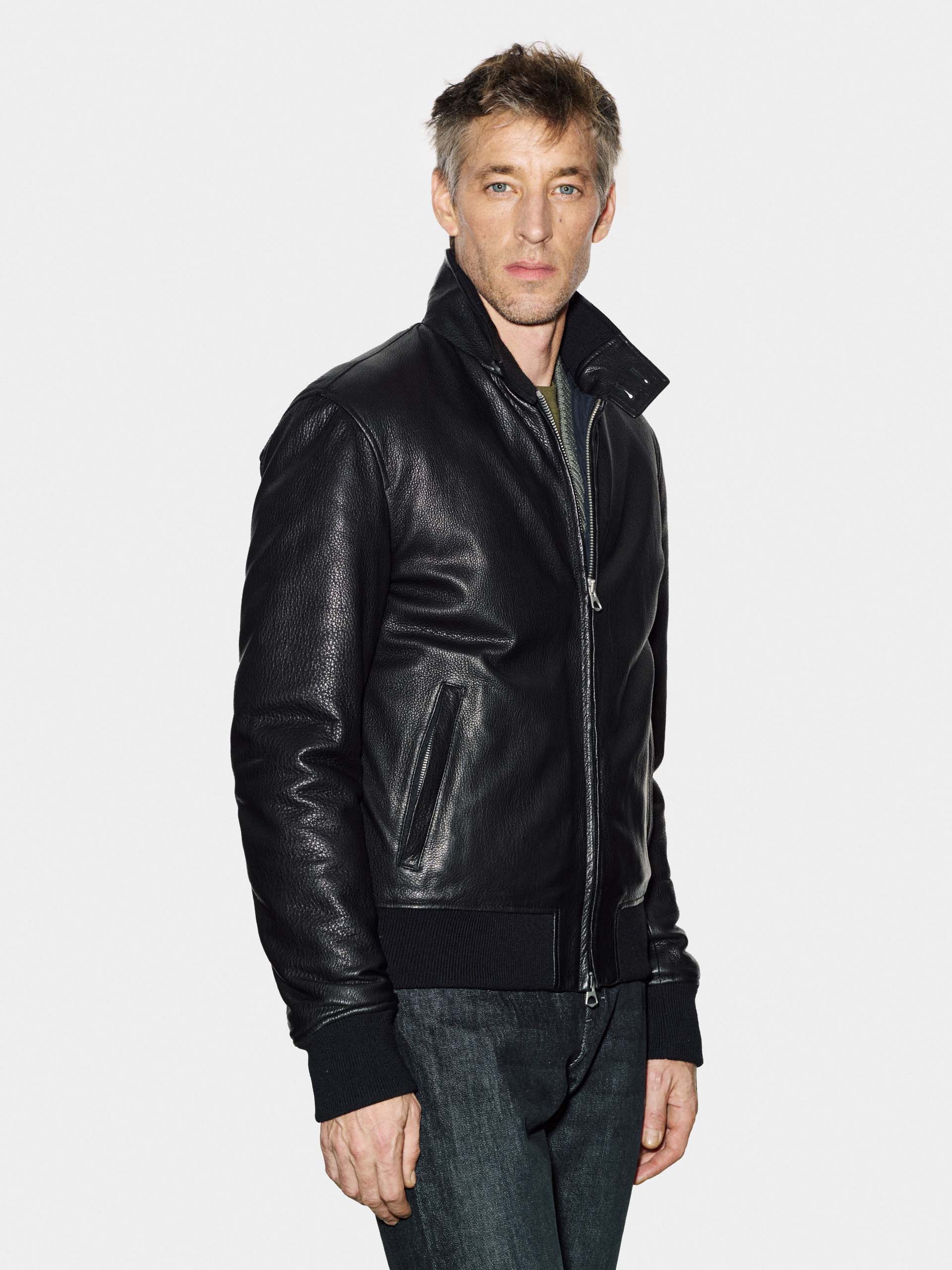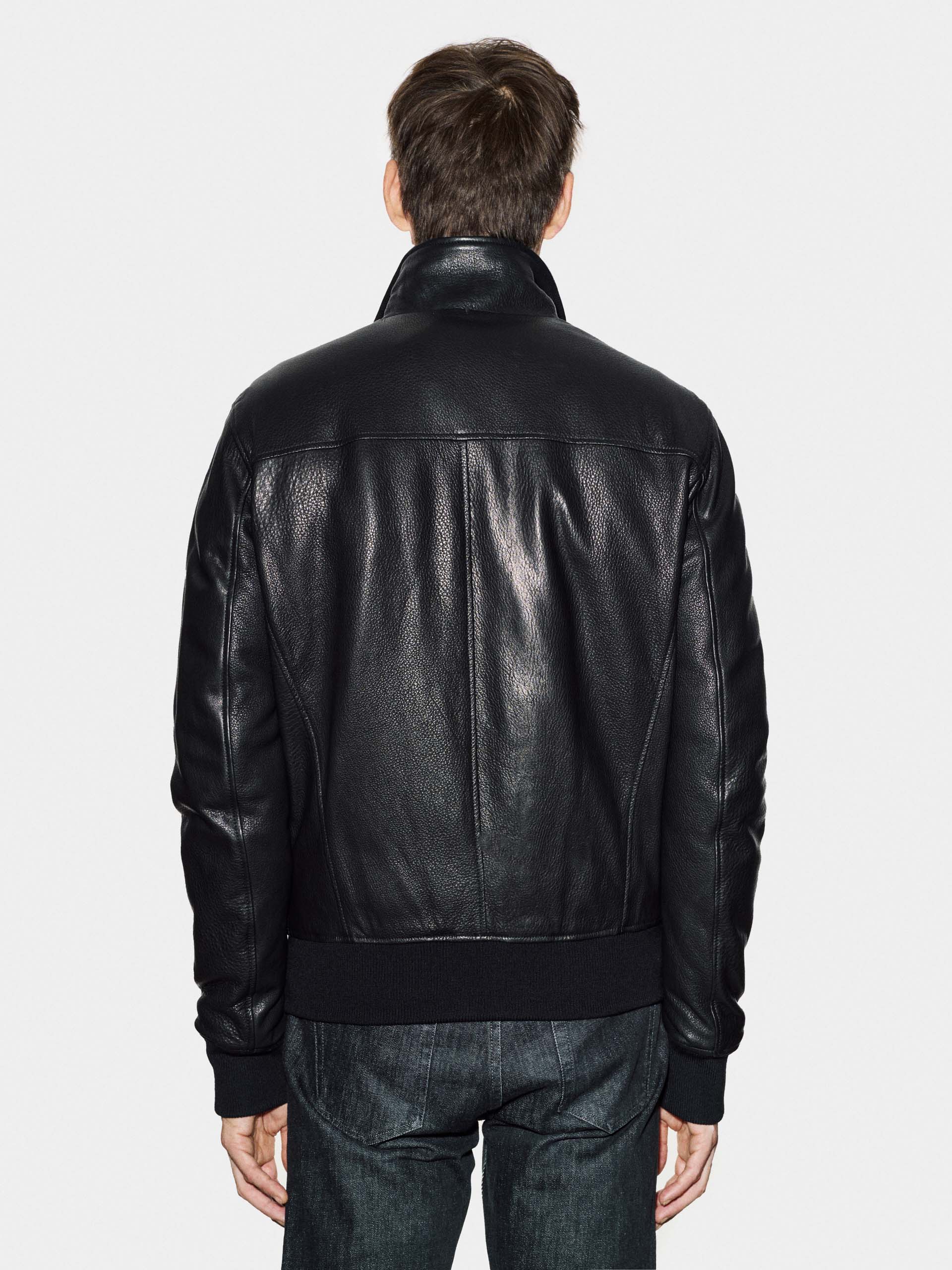 Black pull-up calf leather jacket, durable and waxed, with natural aged effect and essential design crafted for everyday long-lasting wear.