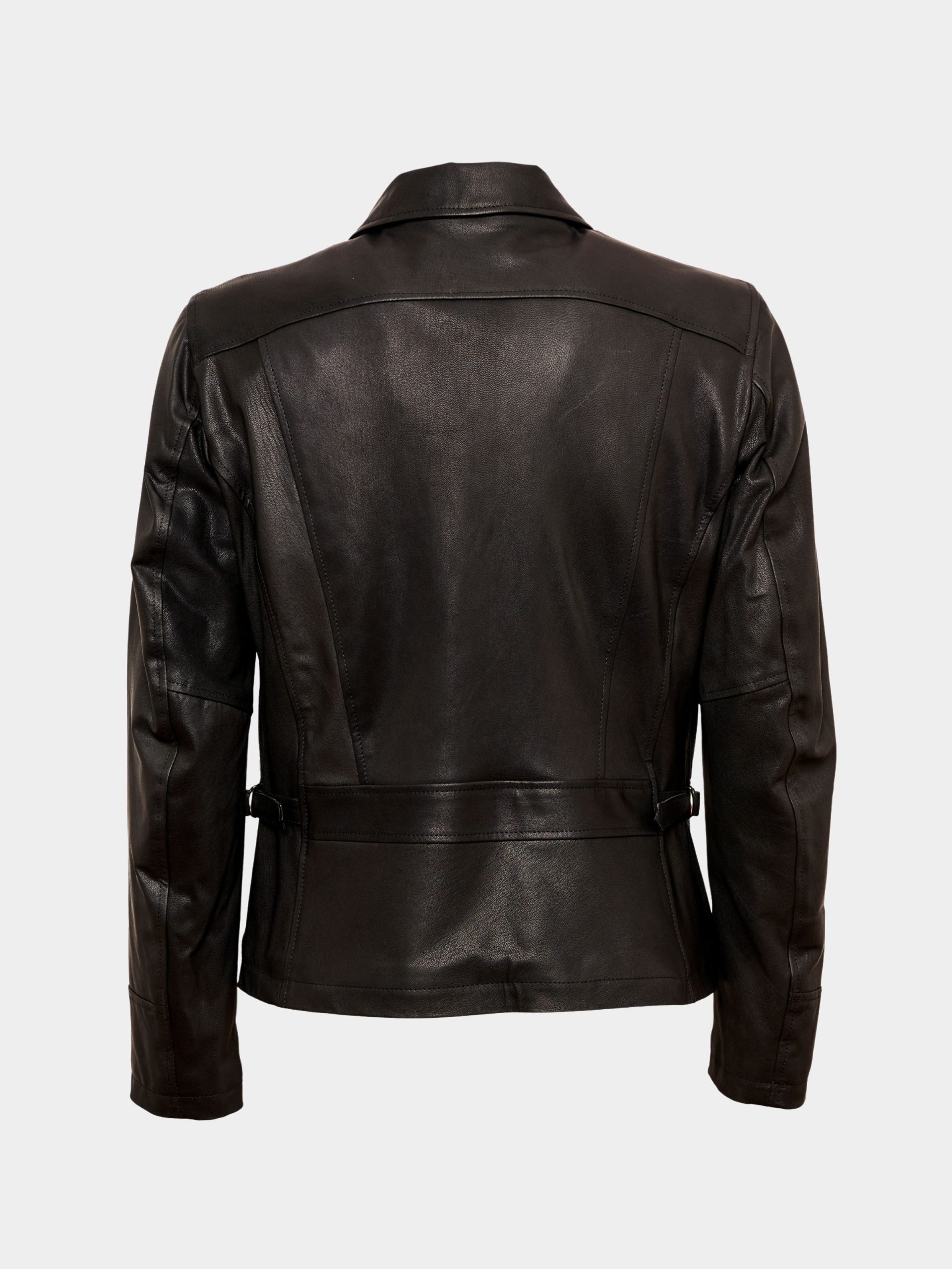 Biker men’s jacket in hammered lamb leather with real goose down padding. Warm, lightweight, and handcrafted in Italy.