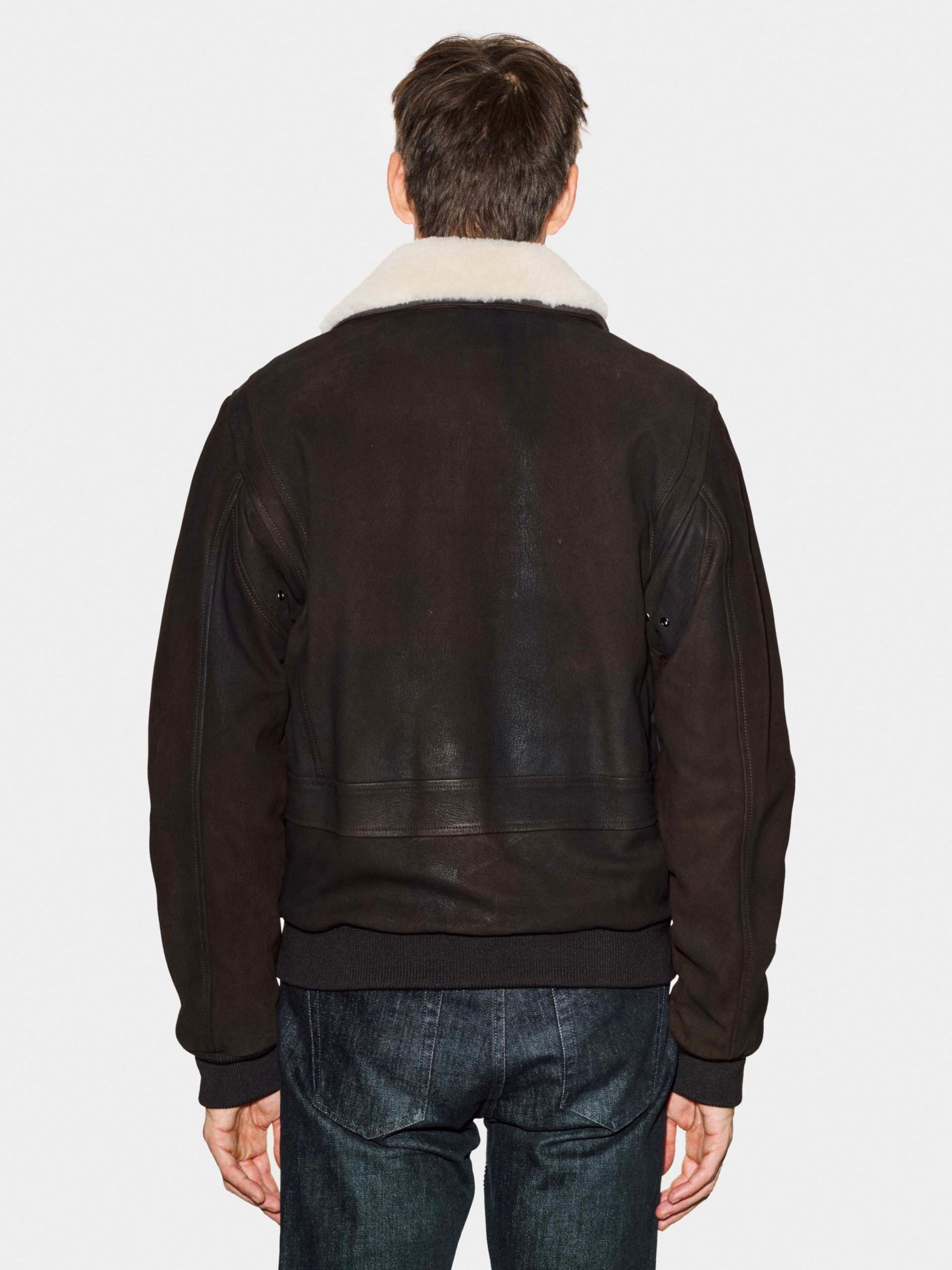 Omega leather jacket with removable shearling collar, double-slider zip and authentic aviator details for comfort, warmth and versatility.