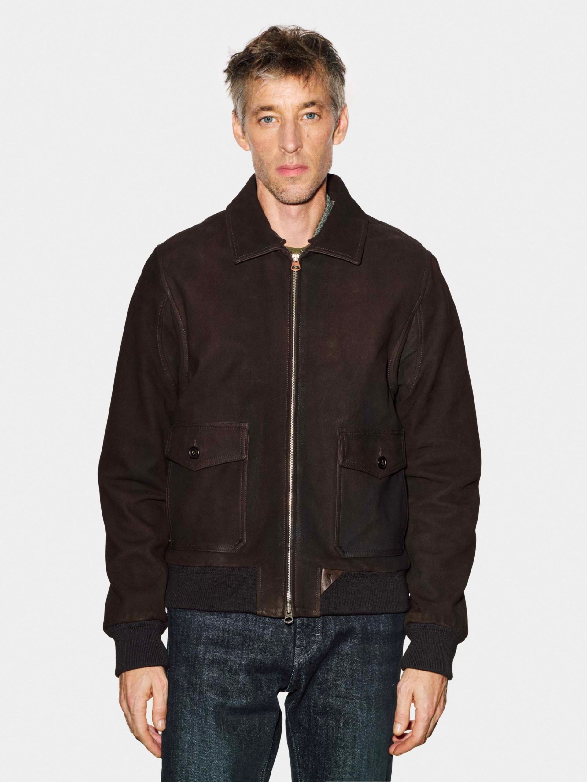 Men’s shearling jacket in “ironed” suede lamb with beige shearling collar, zip and button closure, and side zip pockets. Warm, soft, and timeless.
