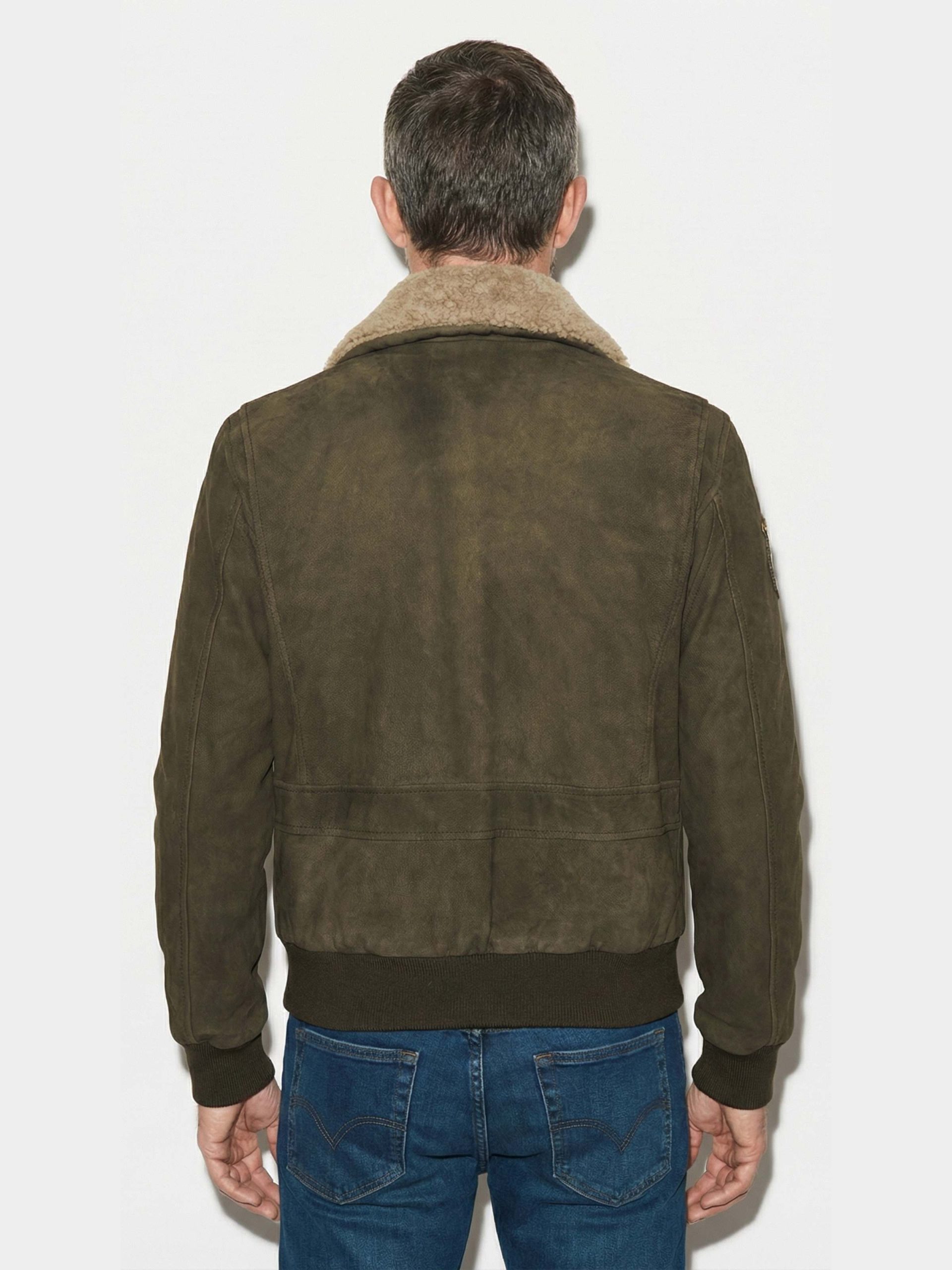 Inspired by classic aviator jackets, the design features a double-slider zipper center closure, removable shearling collar and two patch pockets with flaps.