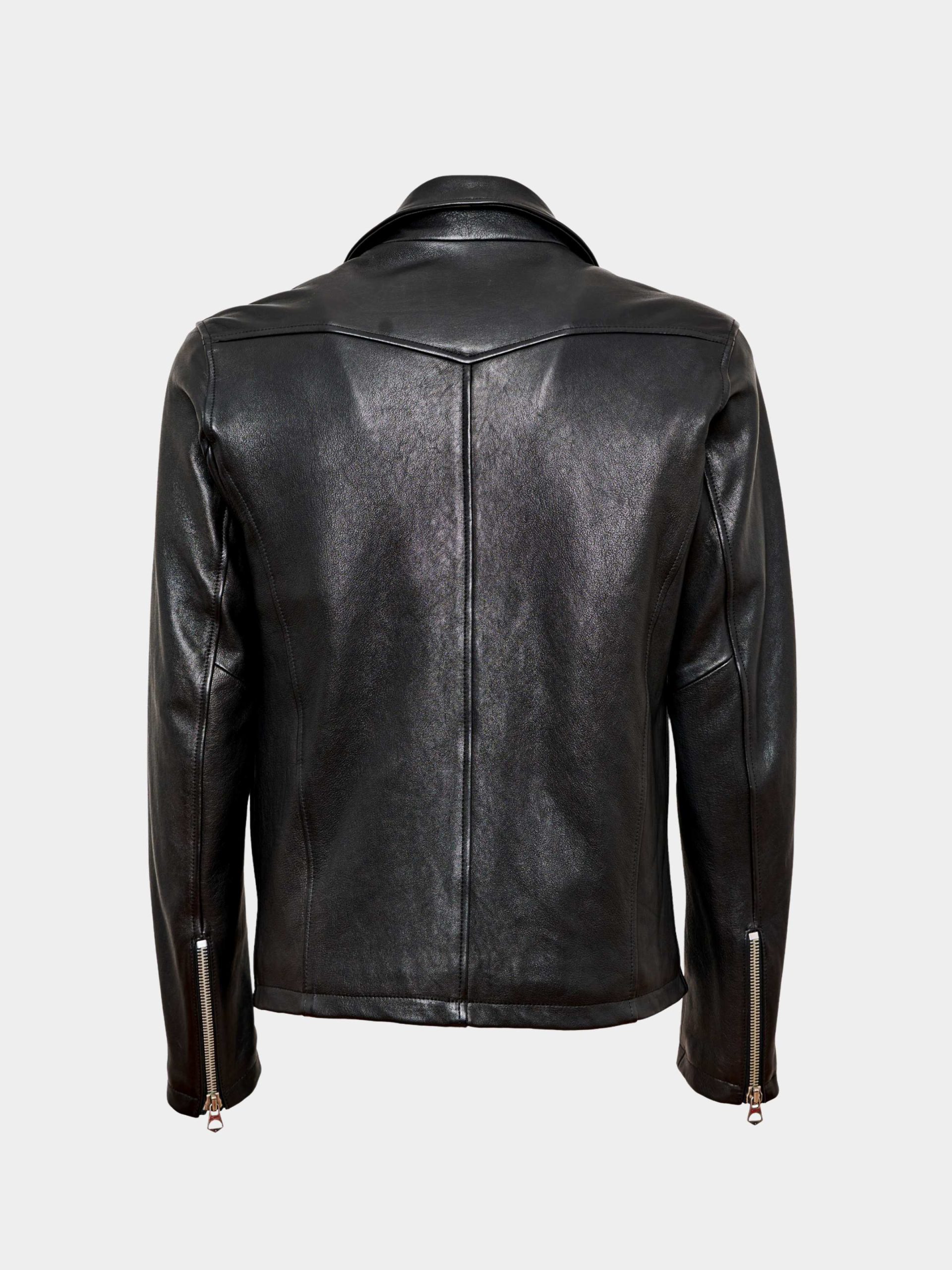 The Wisconsin jacket in premium black vitello leather is a modern reinterpretation of the classic biker style, combining artisanal Italian craftsmanship with a bold, contemporary attitude. Its asymmetrical zip fastening, structured collar with metal snap buttons, and multiple functional pockets enhance both aesthetics and practicality. Made from high-quality calfskin, the jacket offers a naturally smooth texture, durability, and a refined shine. Perfect for everyday wear or urban looks, it embodies timeless character and unmistakable refinement.