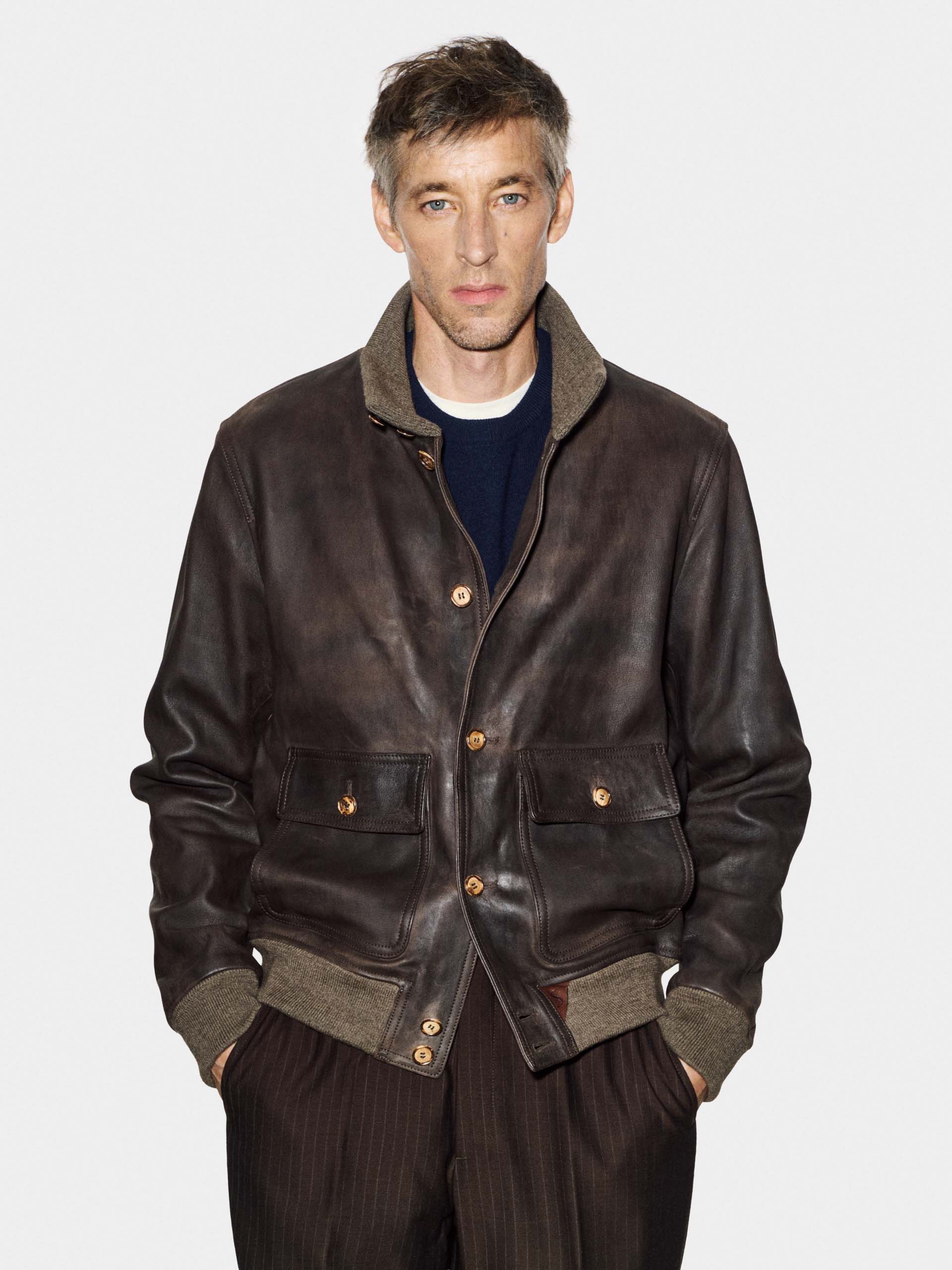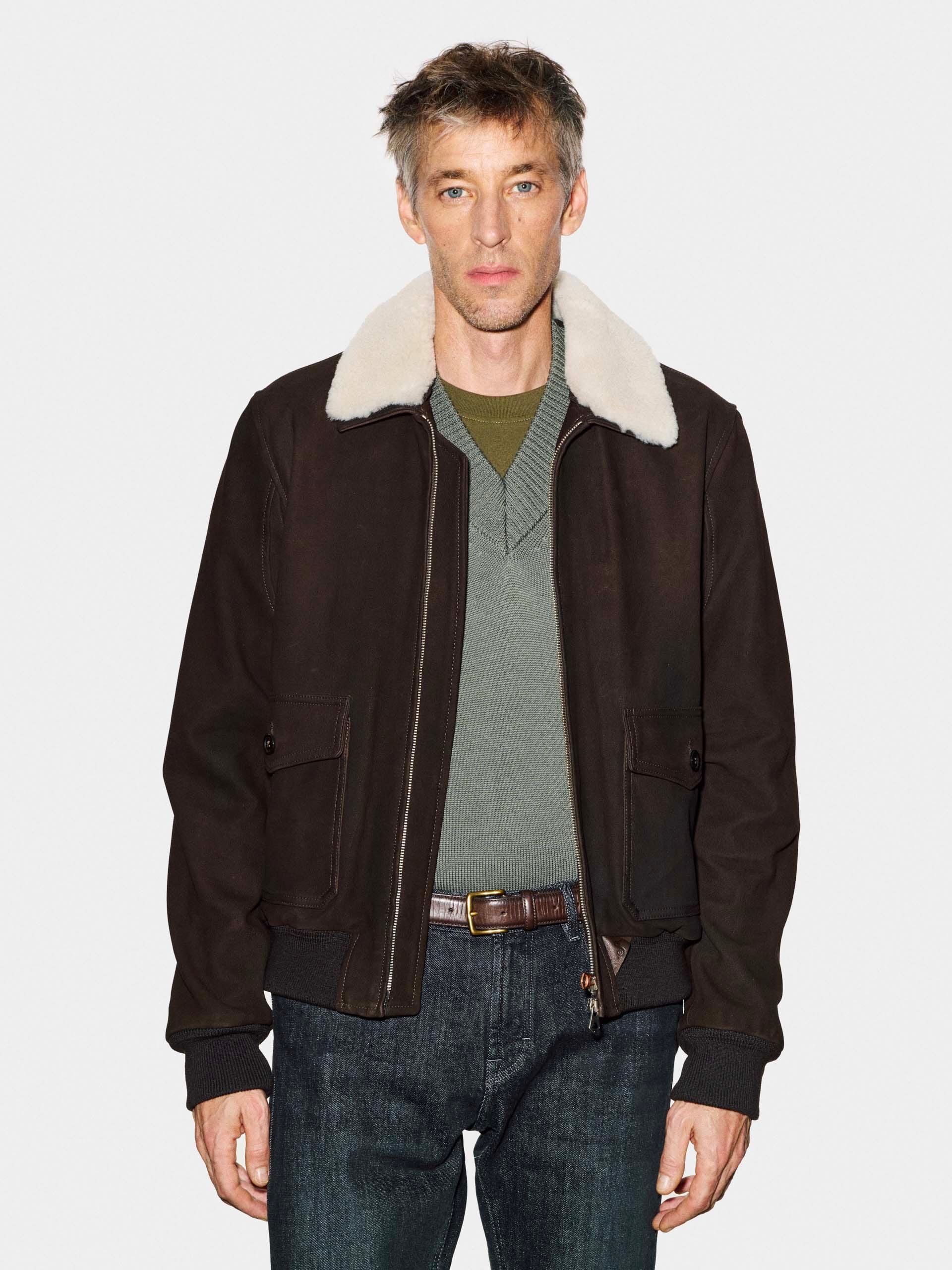 Men’s aviator jacket in Chevrette goat leather, dark brown color.
