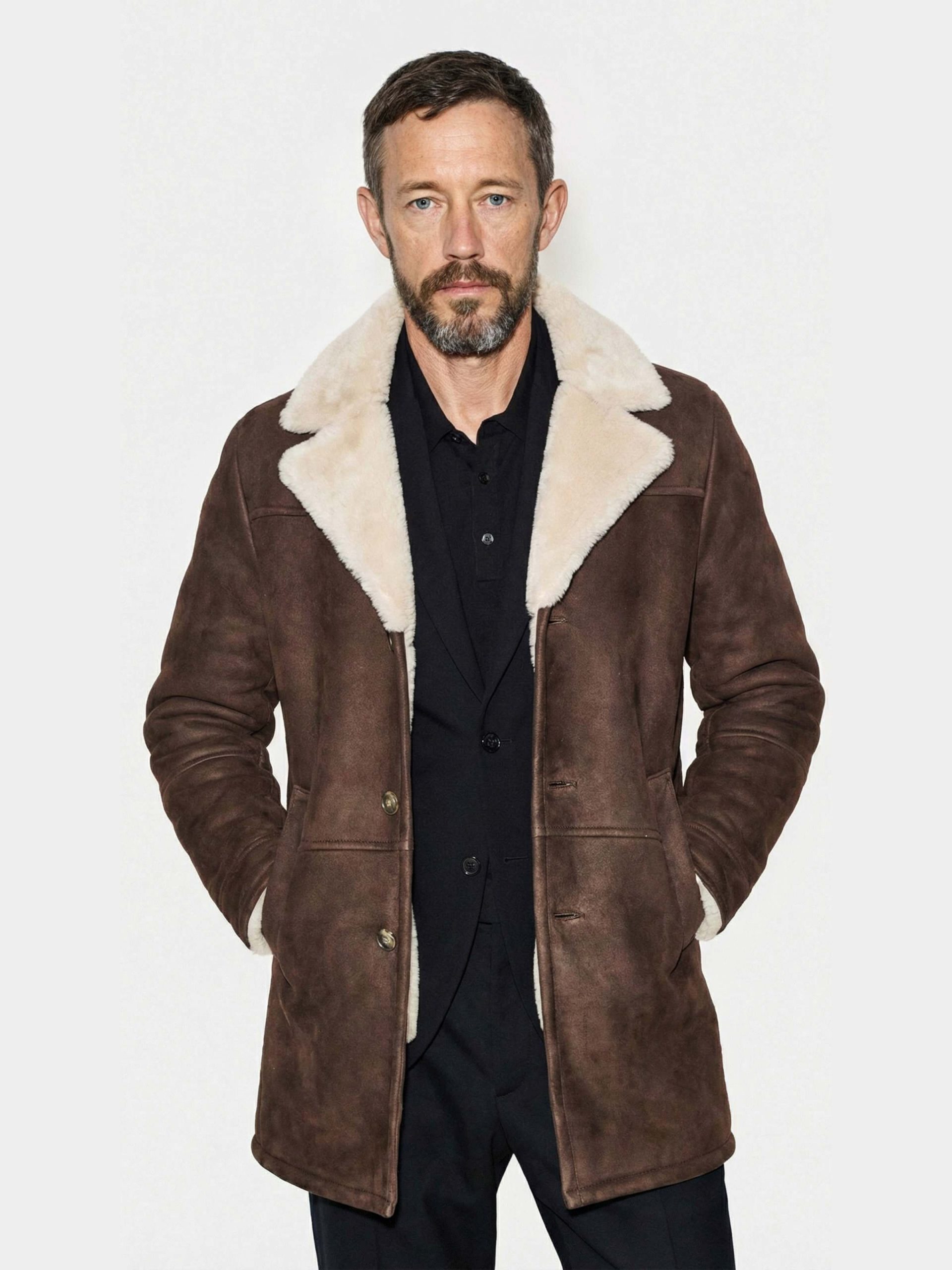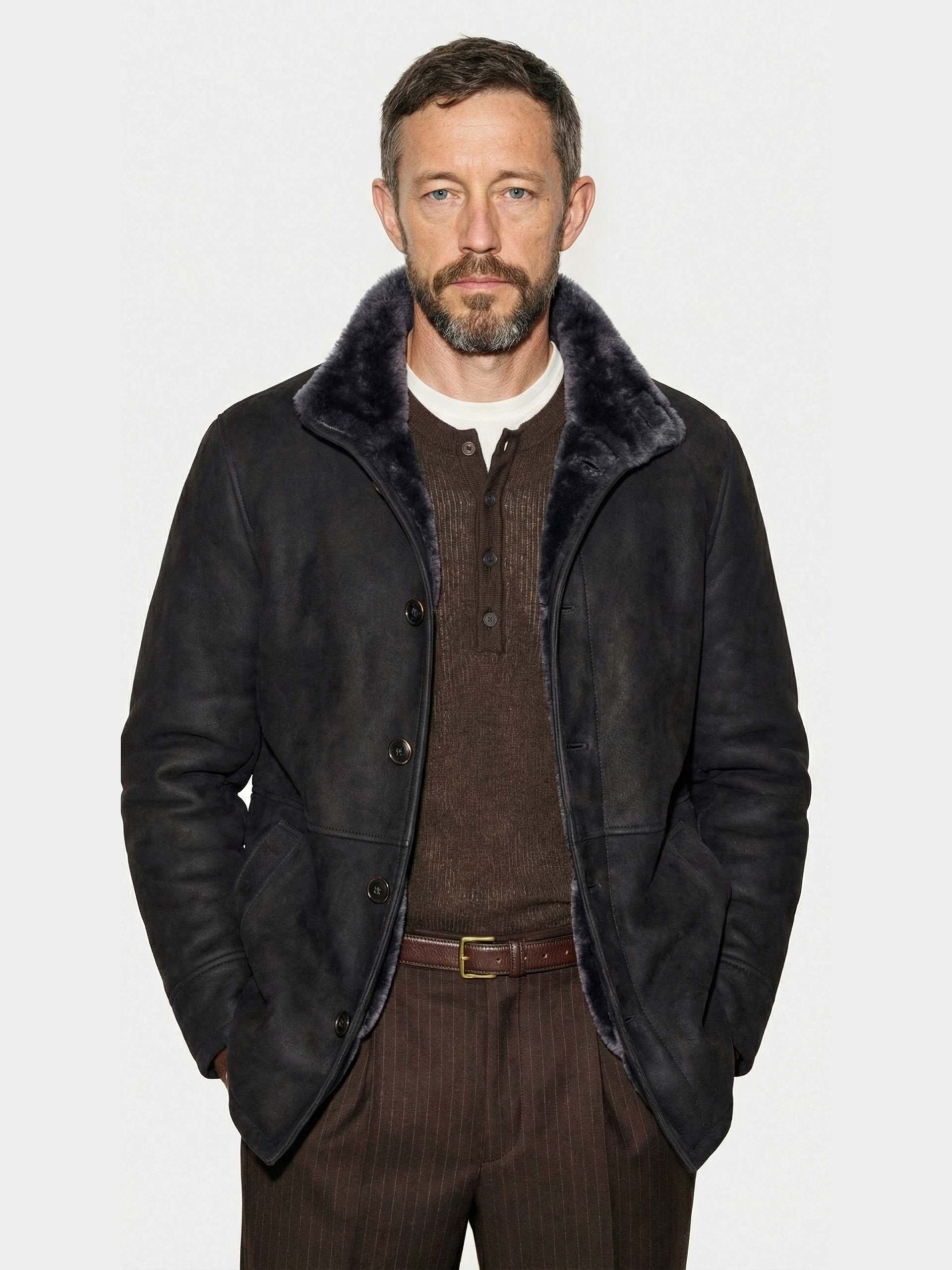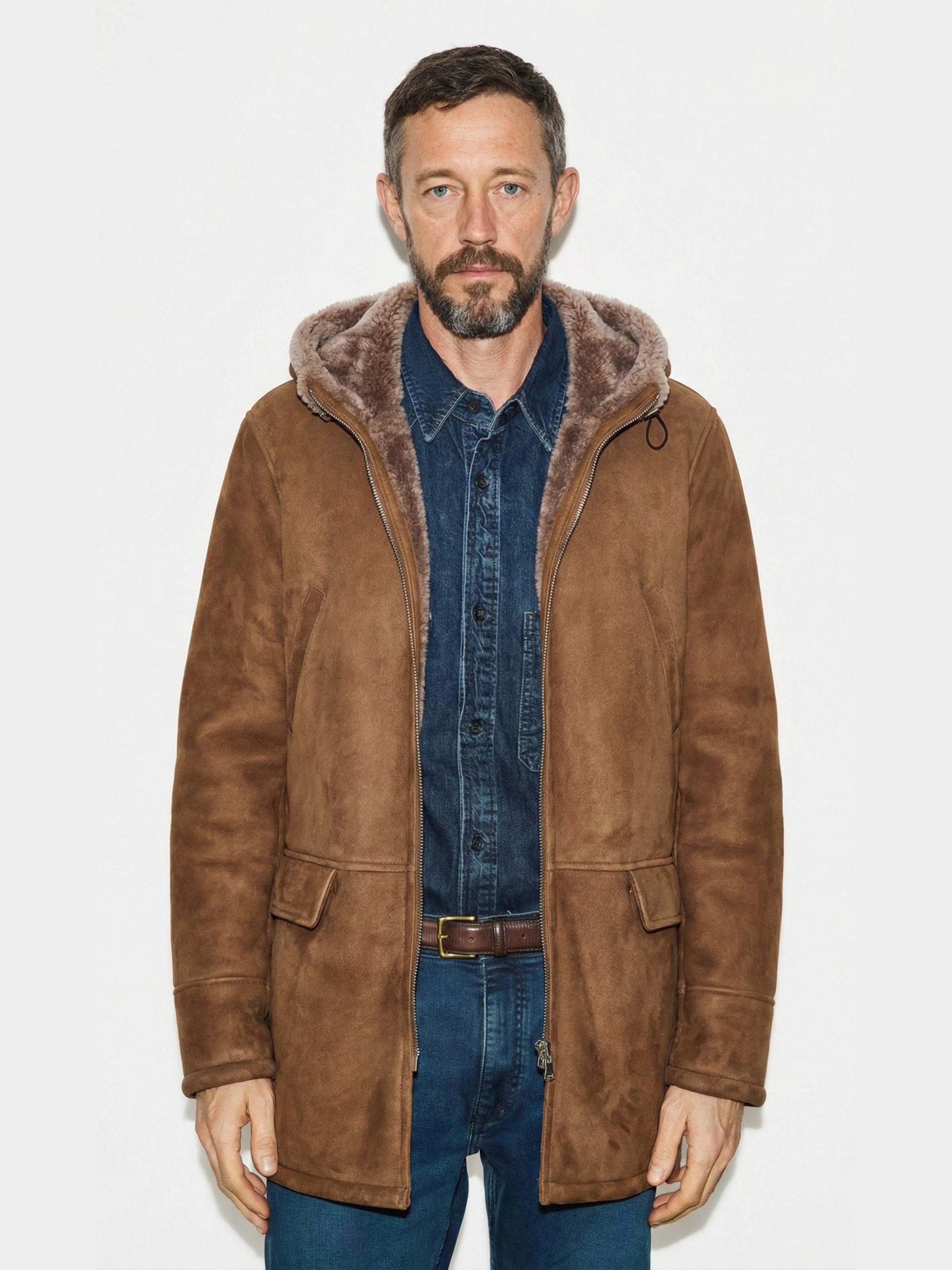 Merino ironed shearling jacket with dark brown suede exterior and beige interior.