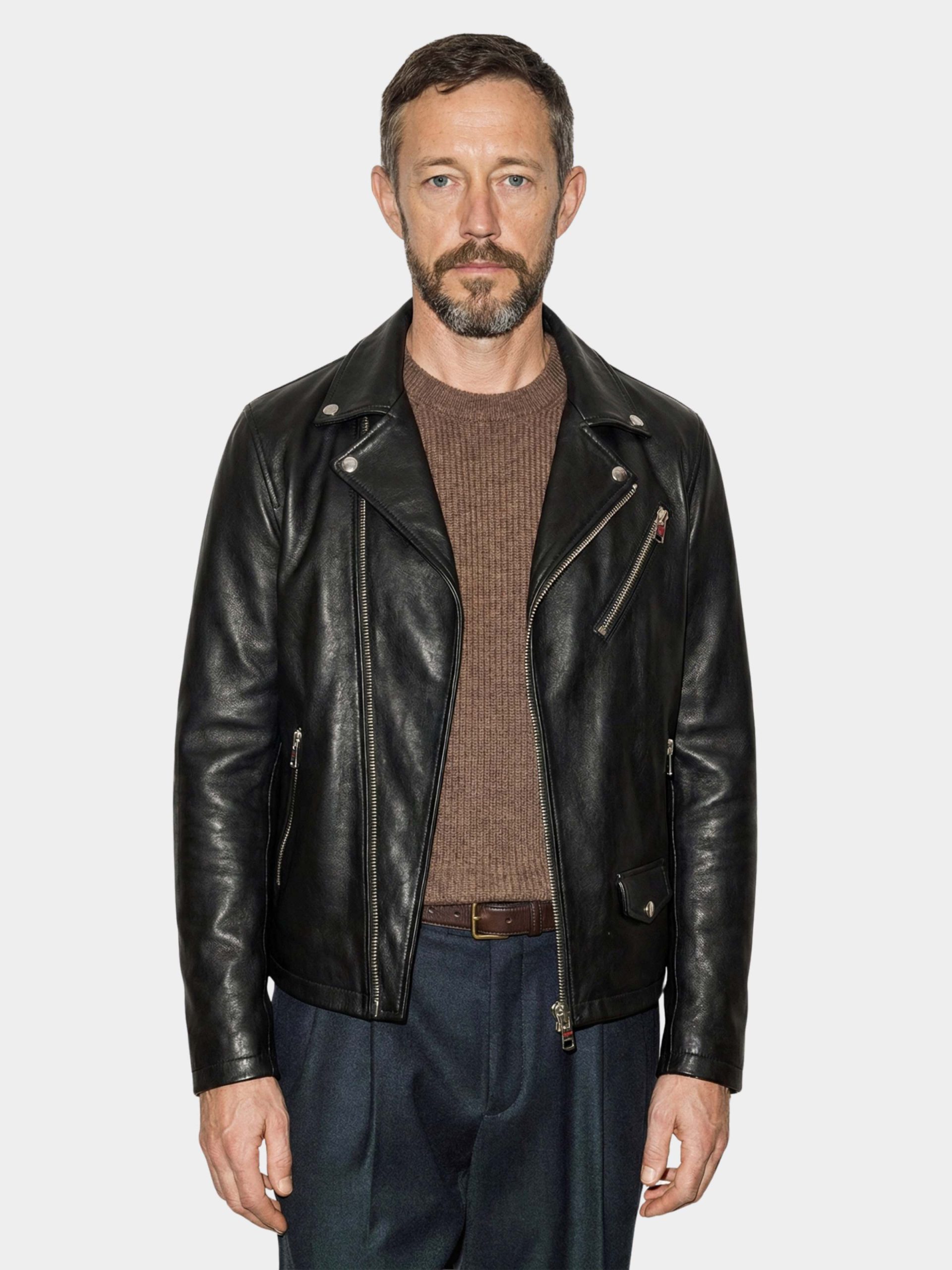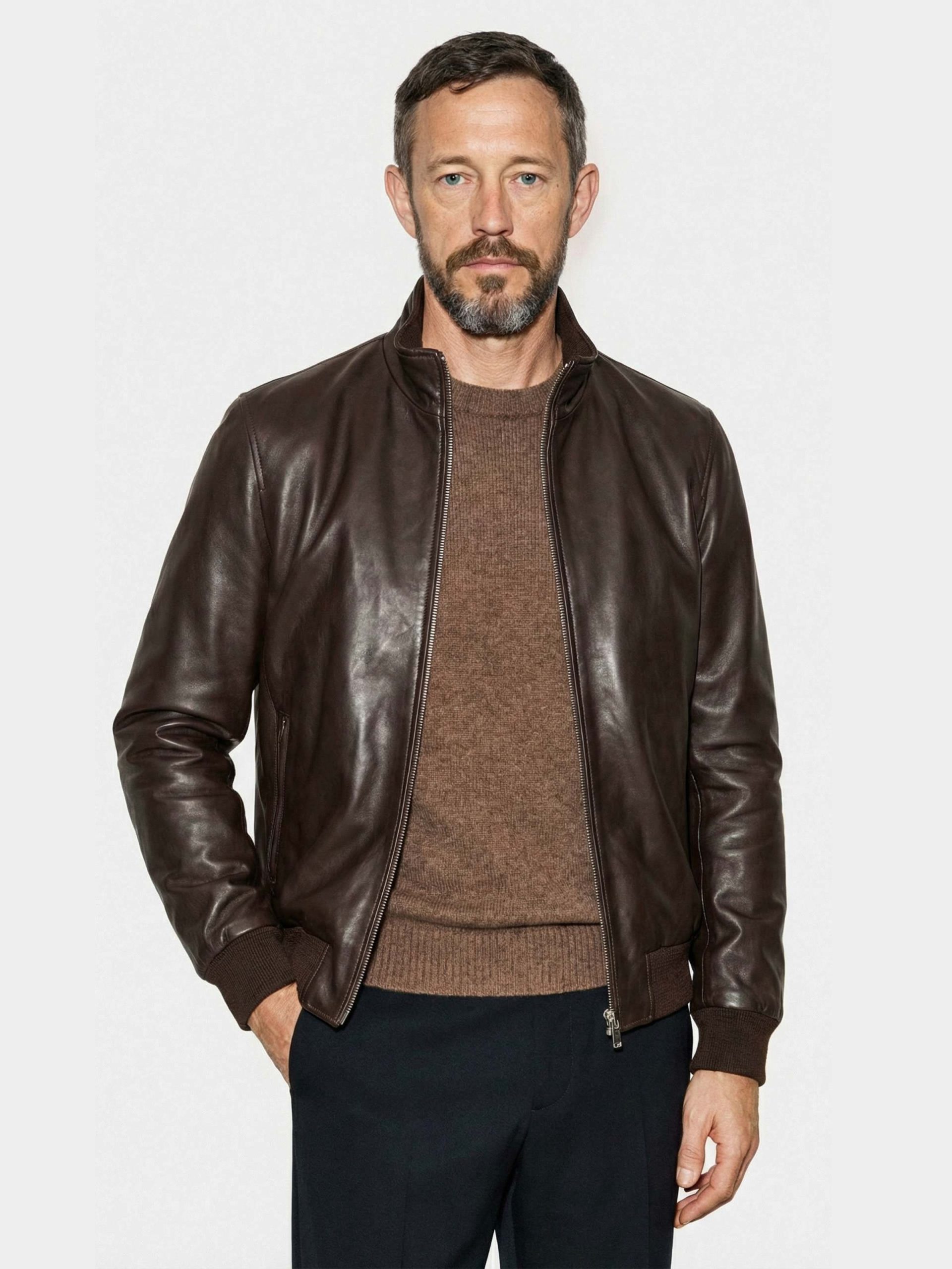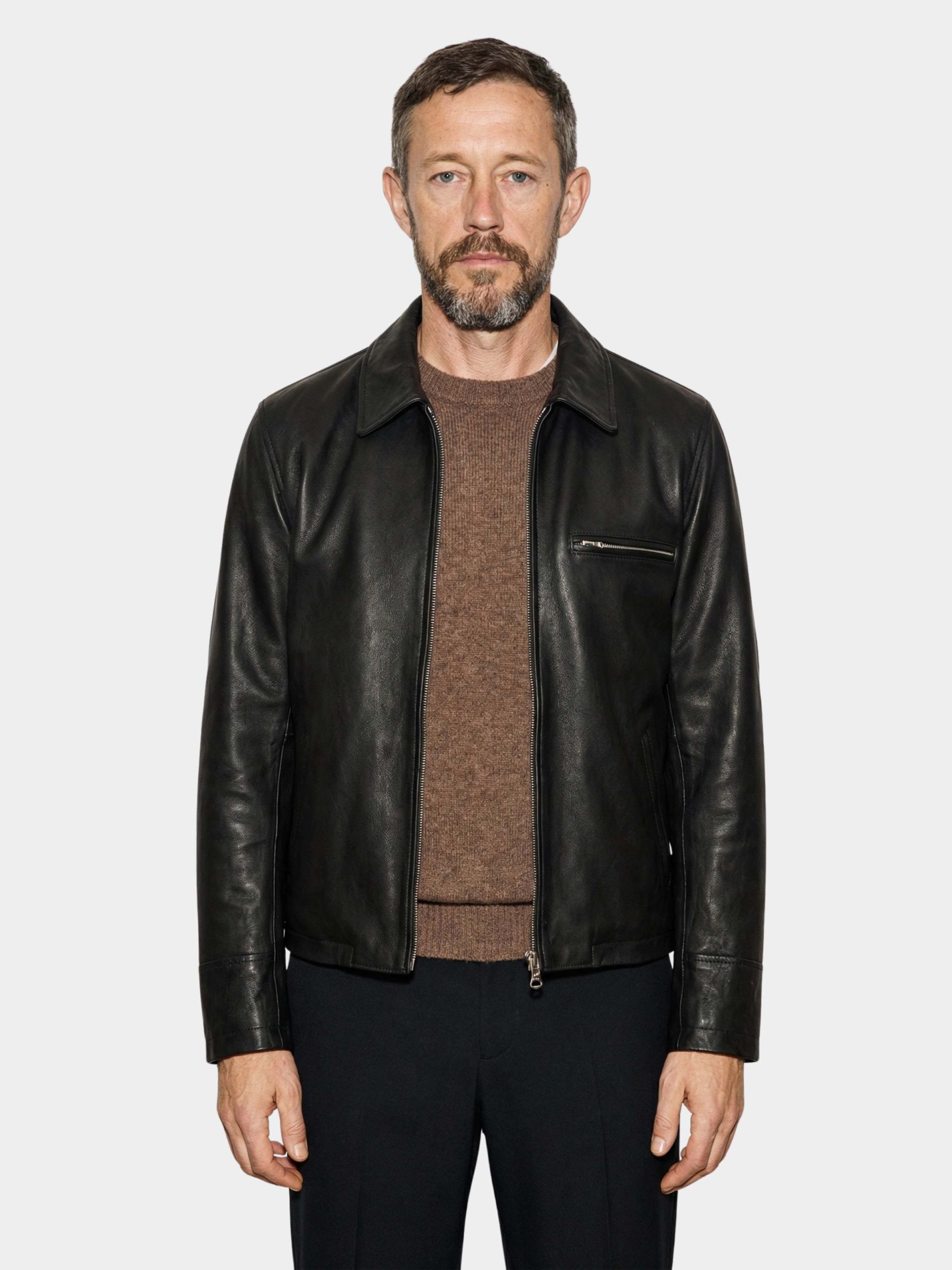 Soft goat glove leather jacket with clean lines, double-slider zipper, chest pocket, and shaped side pockets.