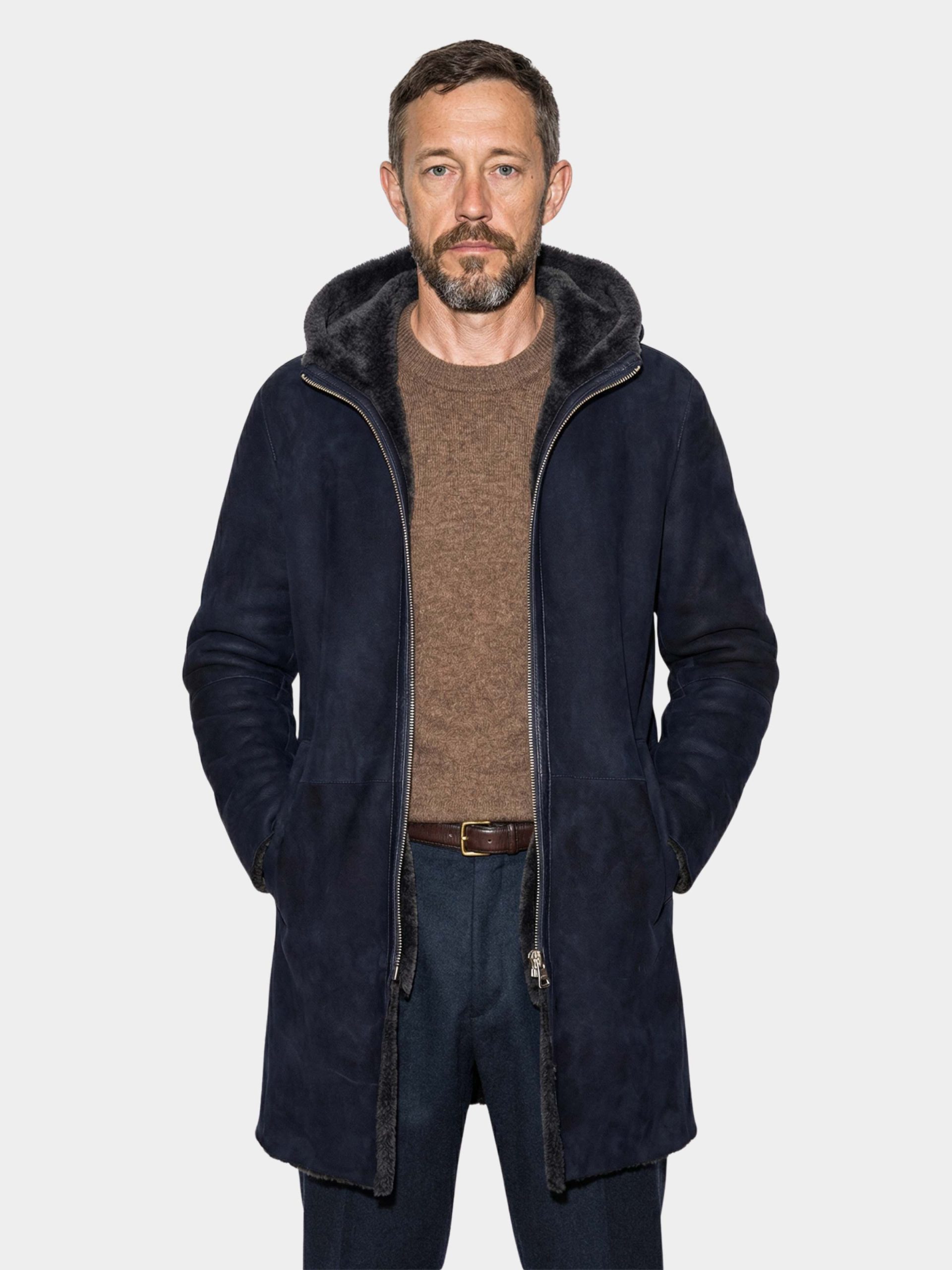 Merino Curly Light shearling coat with hood, two-way zip and handcrafted finishes.
