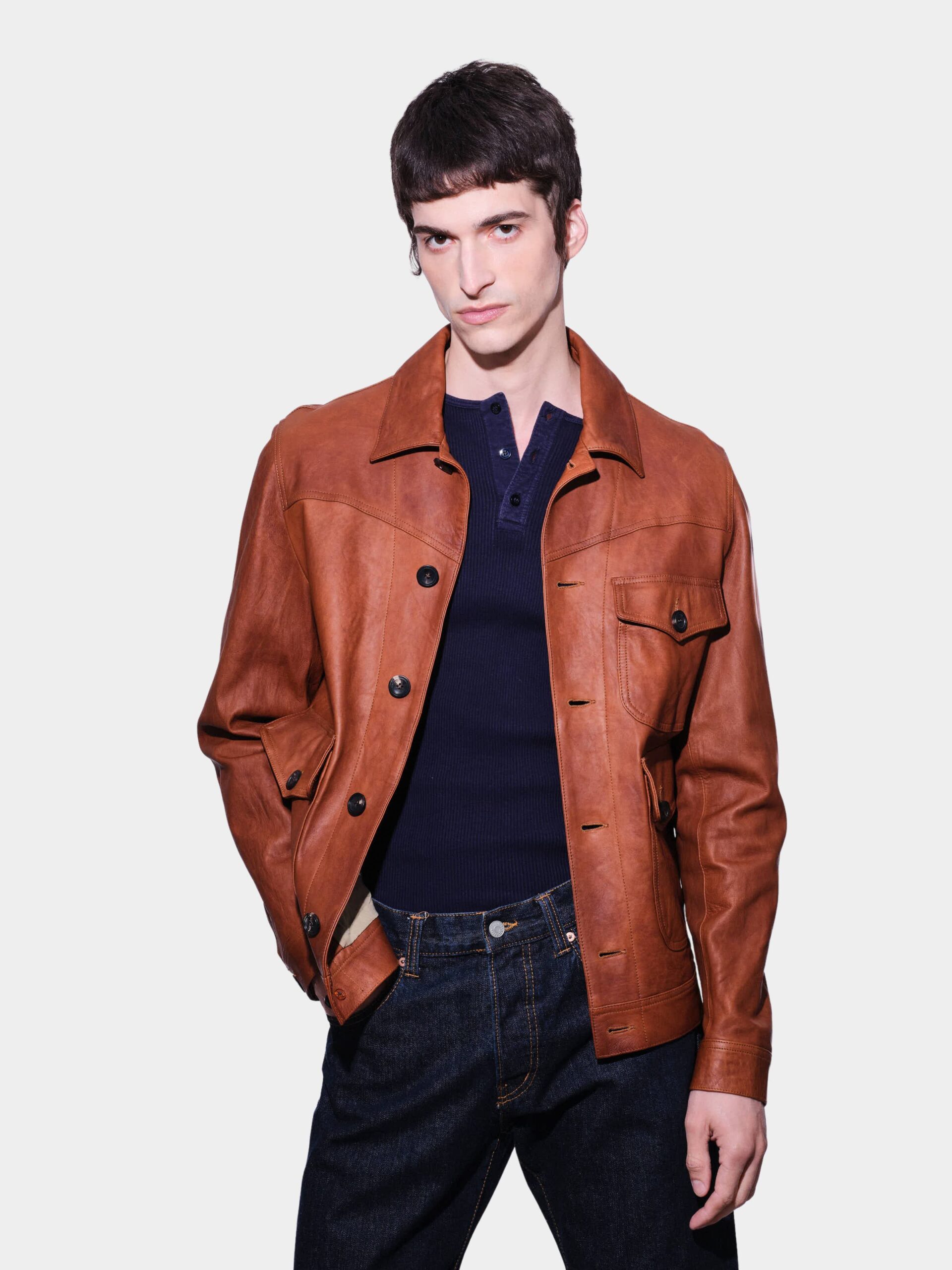 Giubbotto da uomo in pelle Nepal con zip doppio cursore, collo in maglia e finitura liscia e luminosa. Morbido, leggero e dal design essenziale.