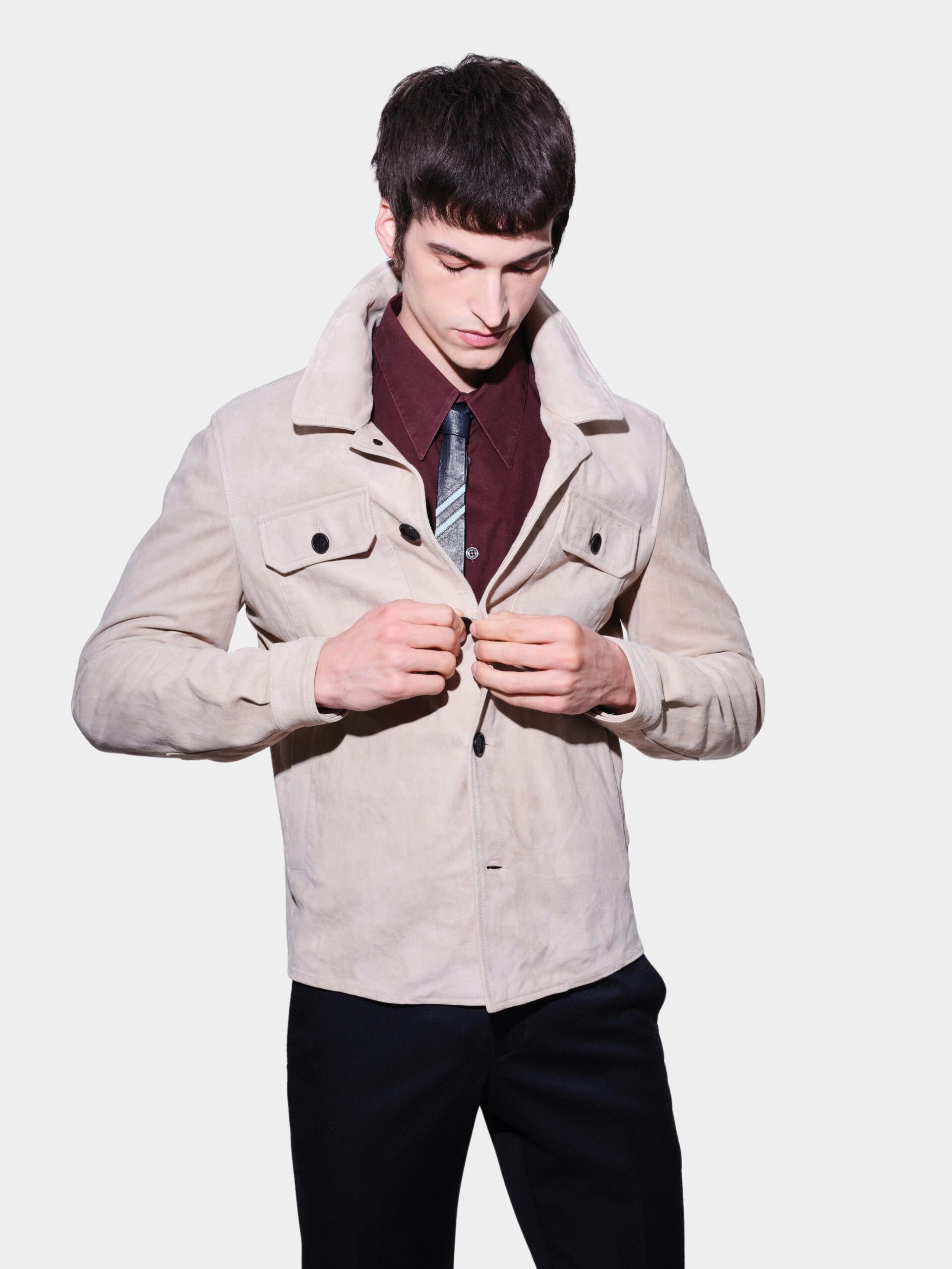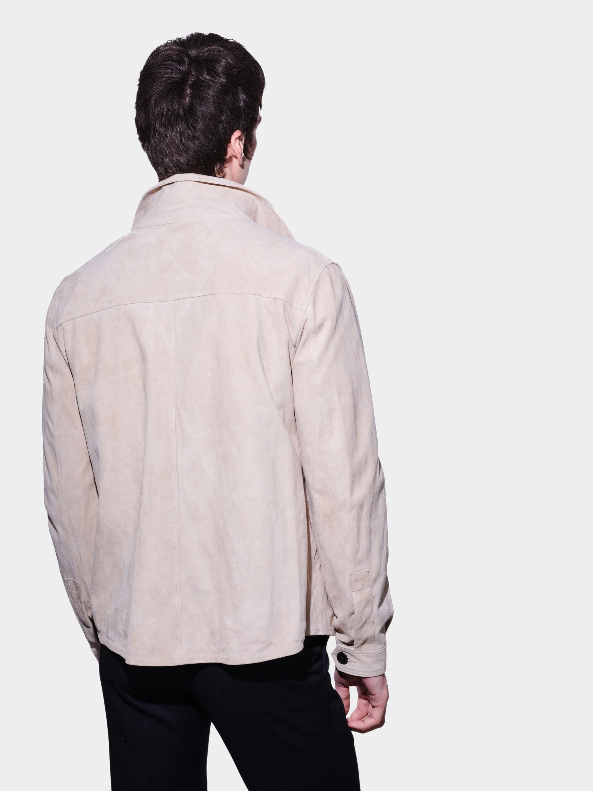 Giacca da uomo sfoderata in garment suede, un camoscio leggero e morbido che assicura comfort e uno stile sofisticato. Chiusura frontale con bottoni, tasche a toppa sul petto con bottoni e tasche a filetto sul busto per un look pratico e funzionale. Fondo maniche con polsini abbottonati e collo a camicia per un design casual ma curato.