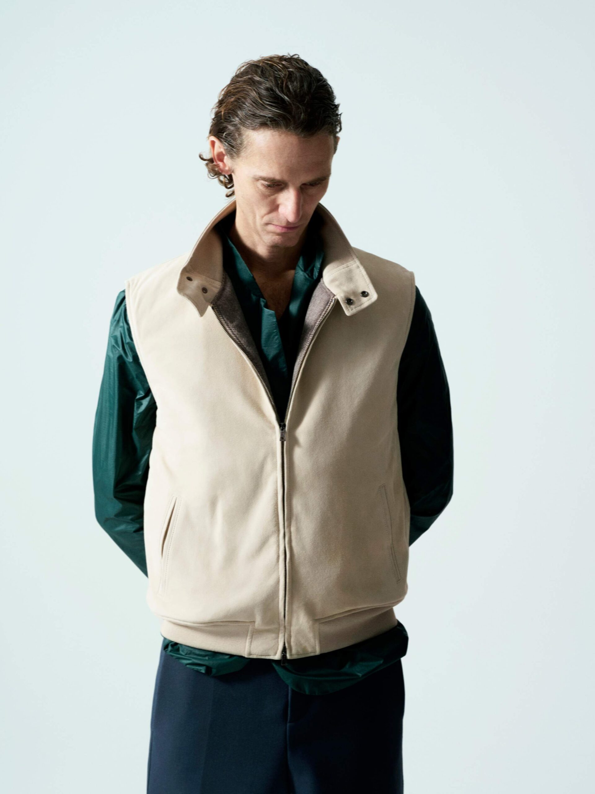 Giacca da uomo con zip doppio cursore e collo barracuda con bottoni. Dettagli in maglia a costine e imbottitura in piuma d’oca per calore, leggerezza e comfort.