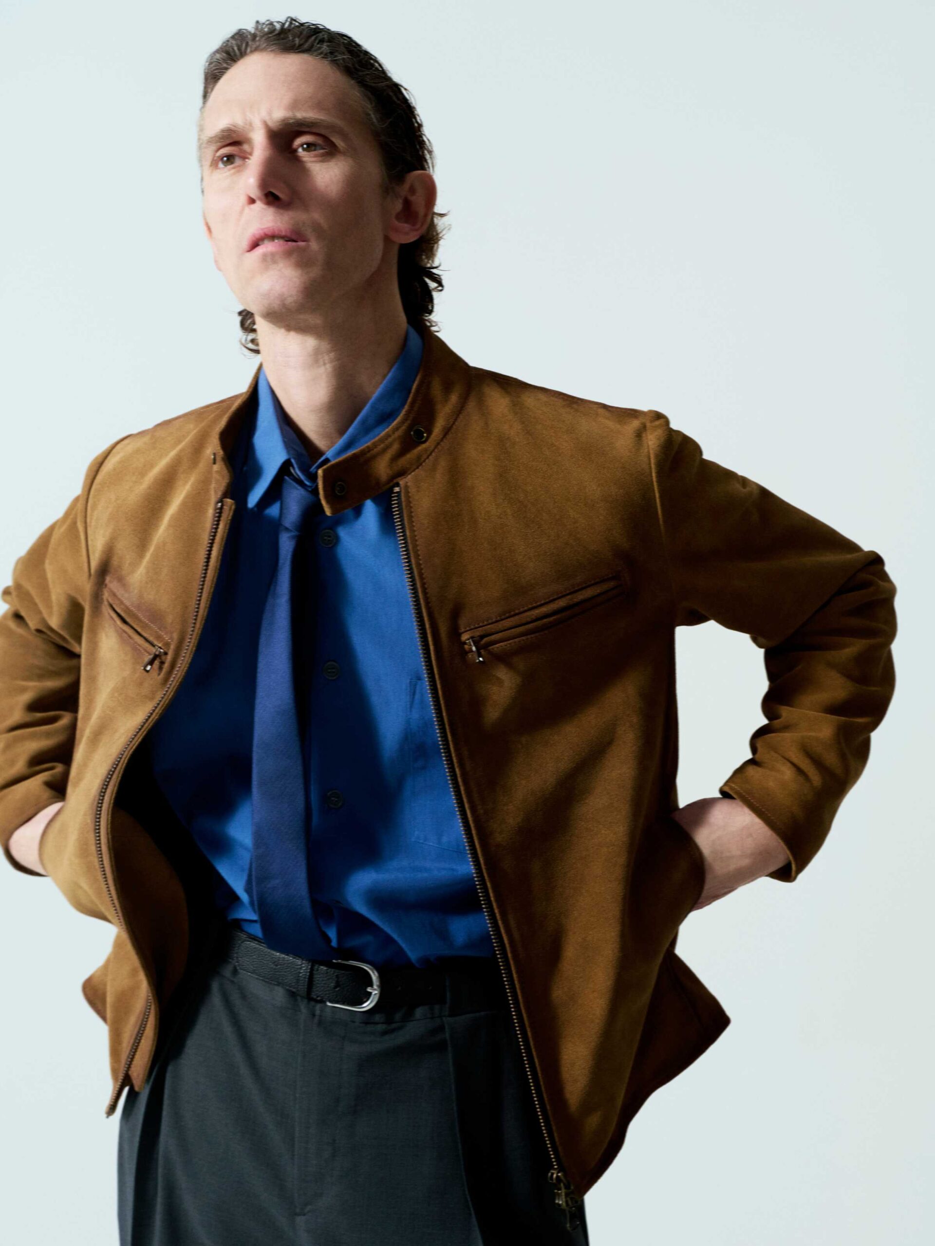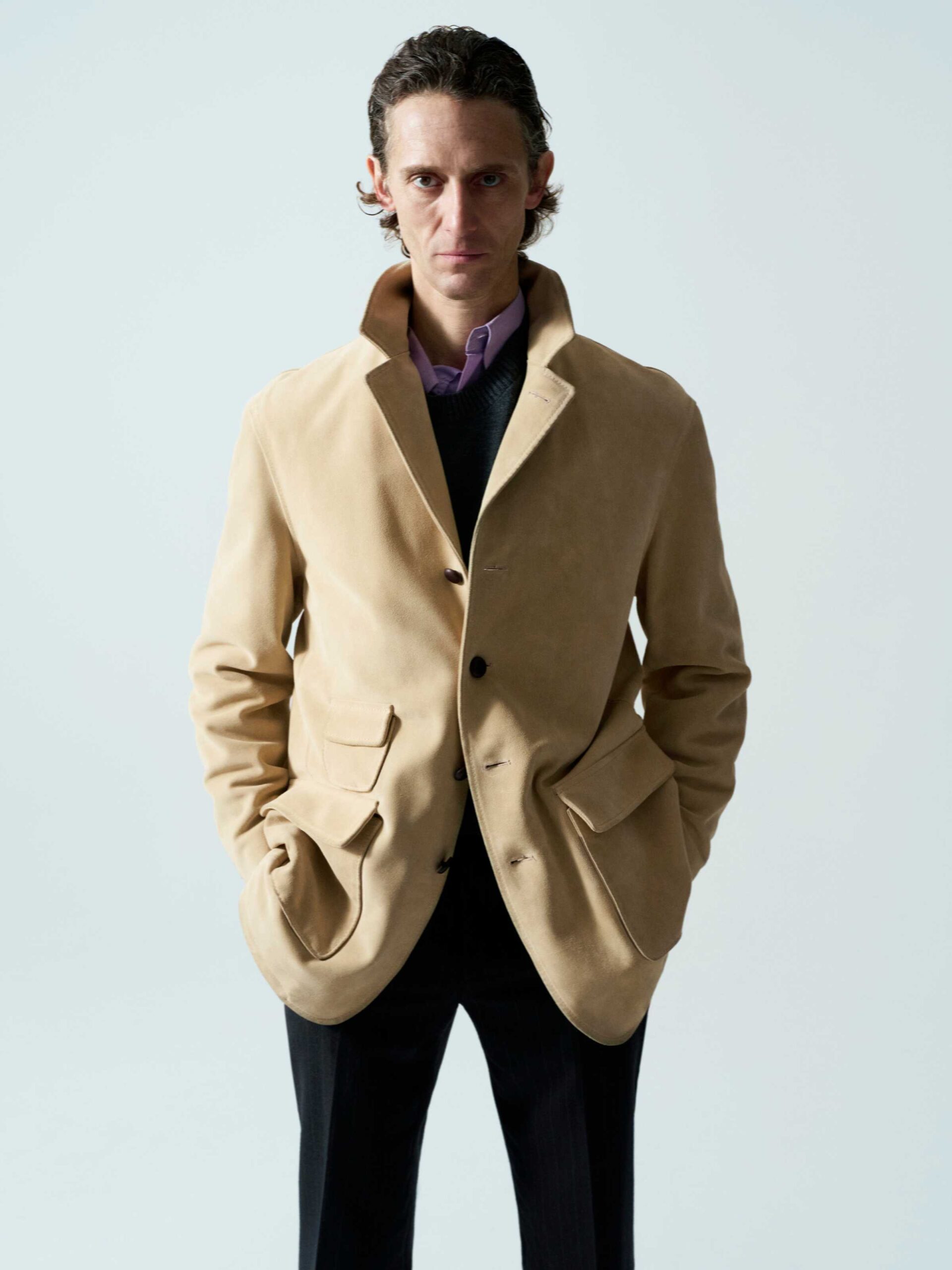 Giubbotto Brando in rough suede color Mastice. Design essenziale, morbidezza e artigianalità Made in Italy.