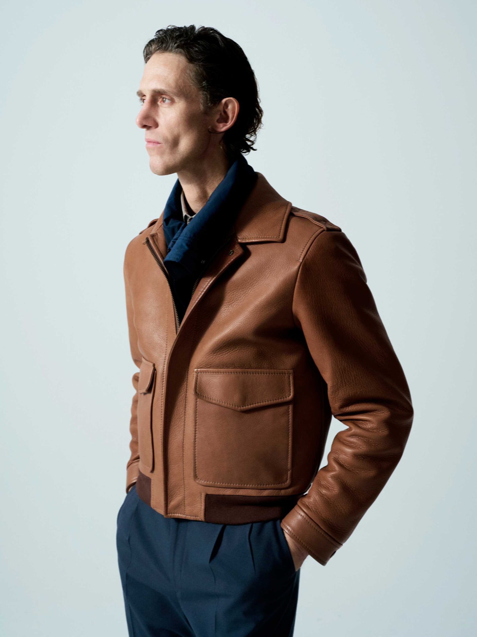 Giubbotto in pelle di cervo color Cigar, morbido e resistente. Design essenziale e artigianalità Made in Italy.